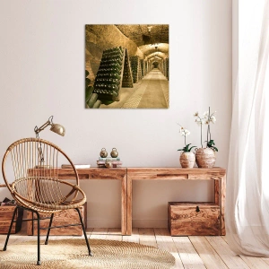 Bild auf Leinwand - Leinwandbild - Ein Weinberg mit einem Keller voller Weinflaschen, die auf Holzregalen ausgestellt sind. - 100x70cm - Die Geburt des Geschmacks - Moderne Wanddekoration für Wohnzimmer und Schlafzimmer ARTTOR