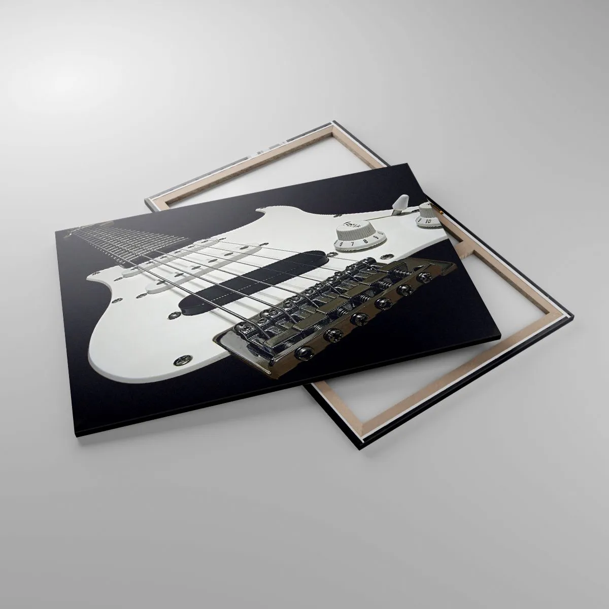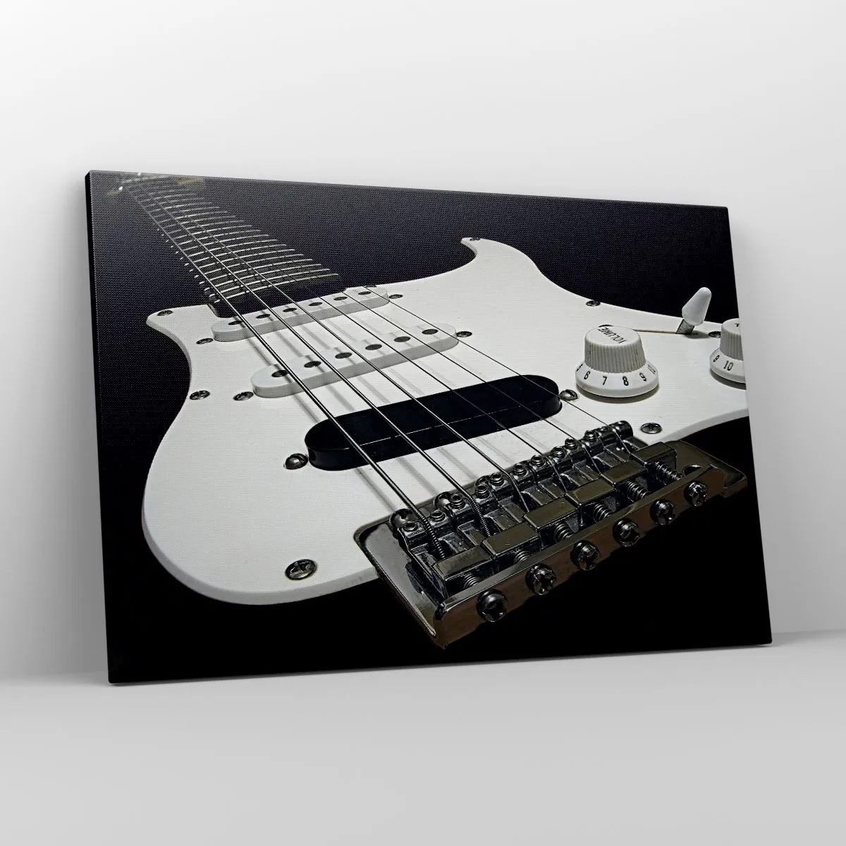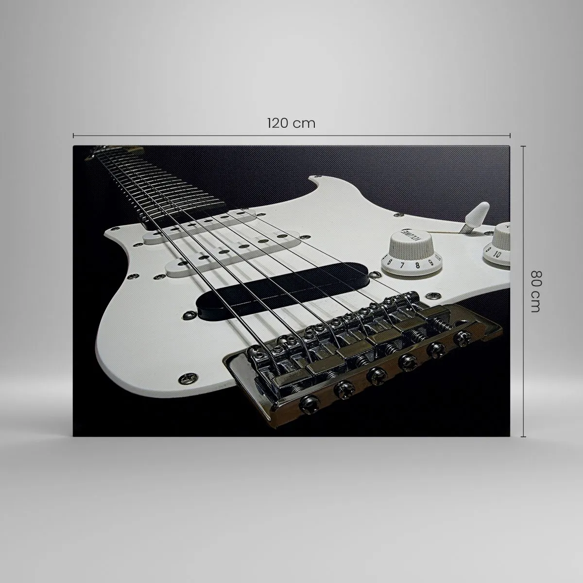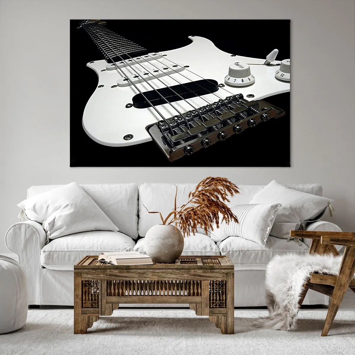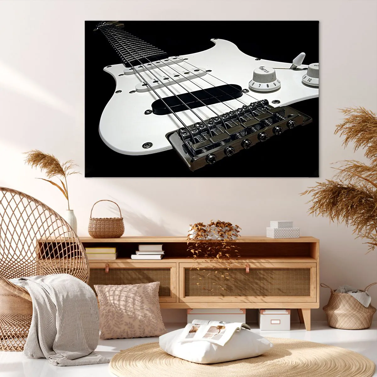 Bild auf Leinwand - Leinwandbild - Nahaufnahme einer weißen E-Gitarre auf schwarzem Hintergrund. - 120x80cm - In Weiß versteckter Ton - Moderne Wanddekoration für Wohnzimmer und Schlafzimmer ARTTOR