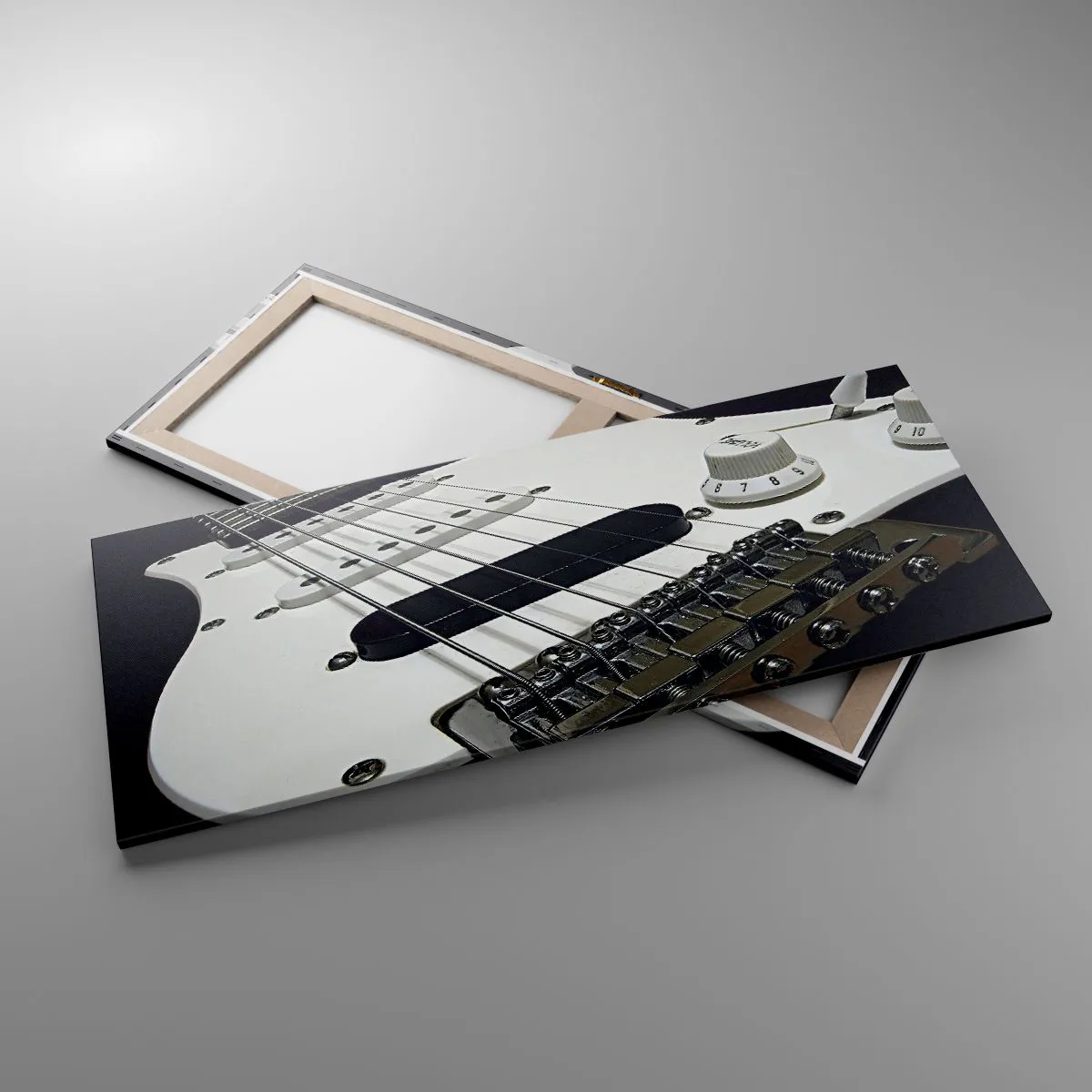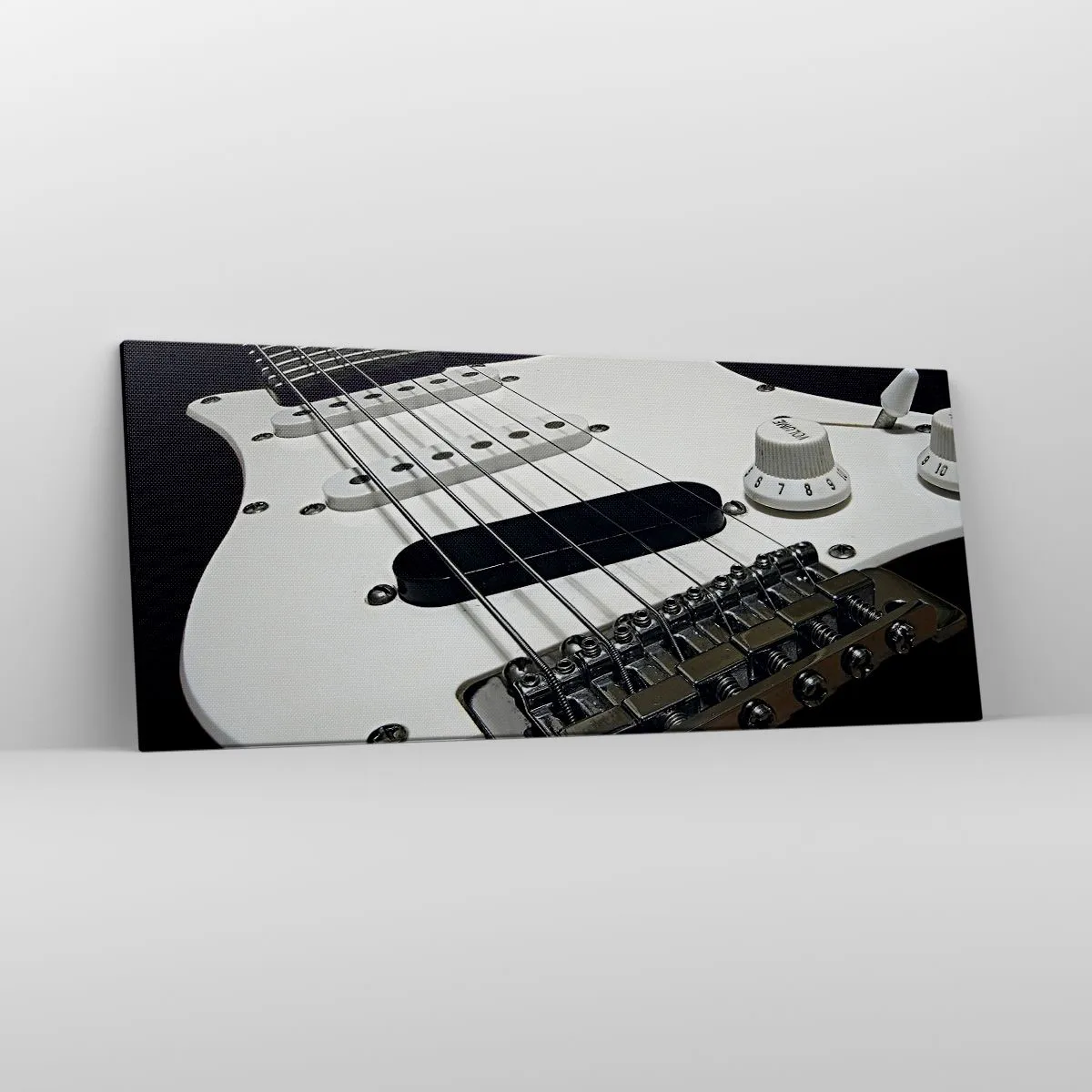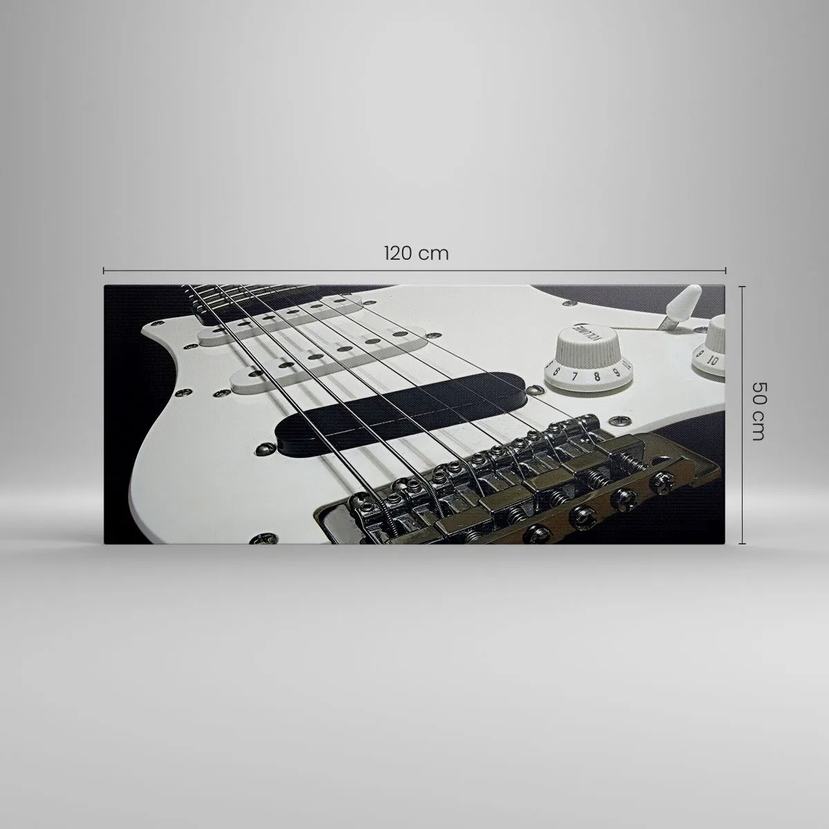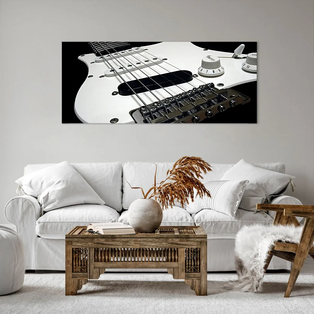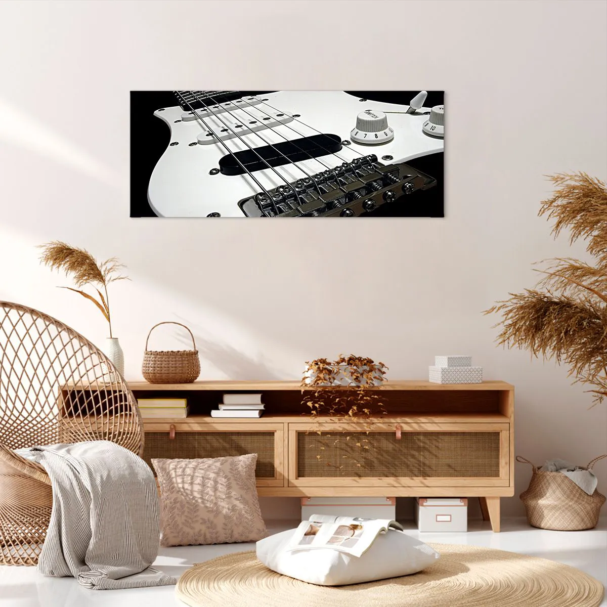 Bild auf Leinwand - Leinwandbild - Nahaufnahme einer weißen E-Gitarre auf schwarzem Hintergrund. - 120x50cm - In Weiß versteckter Ton - Moderne Wanddekoration für Wohnzimmer und Schlafzimmer ARTTOR