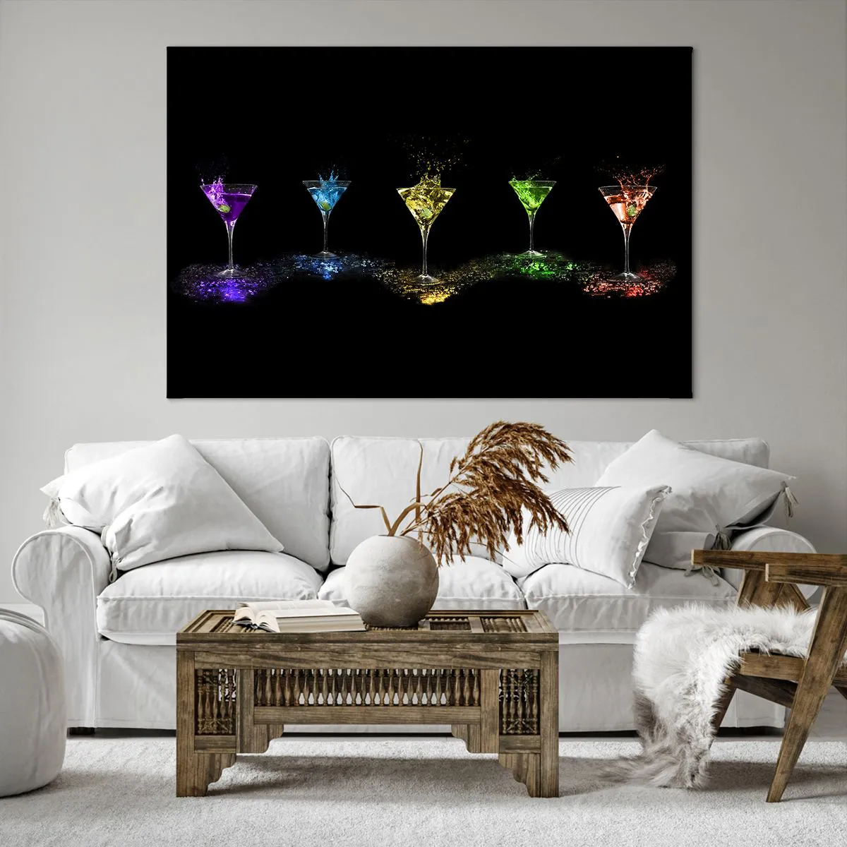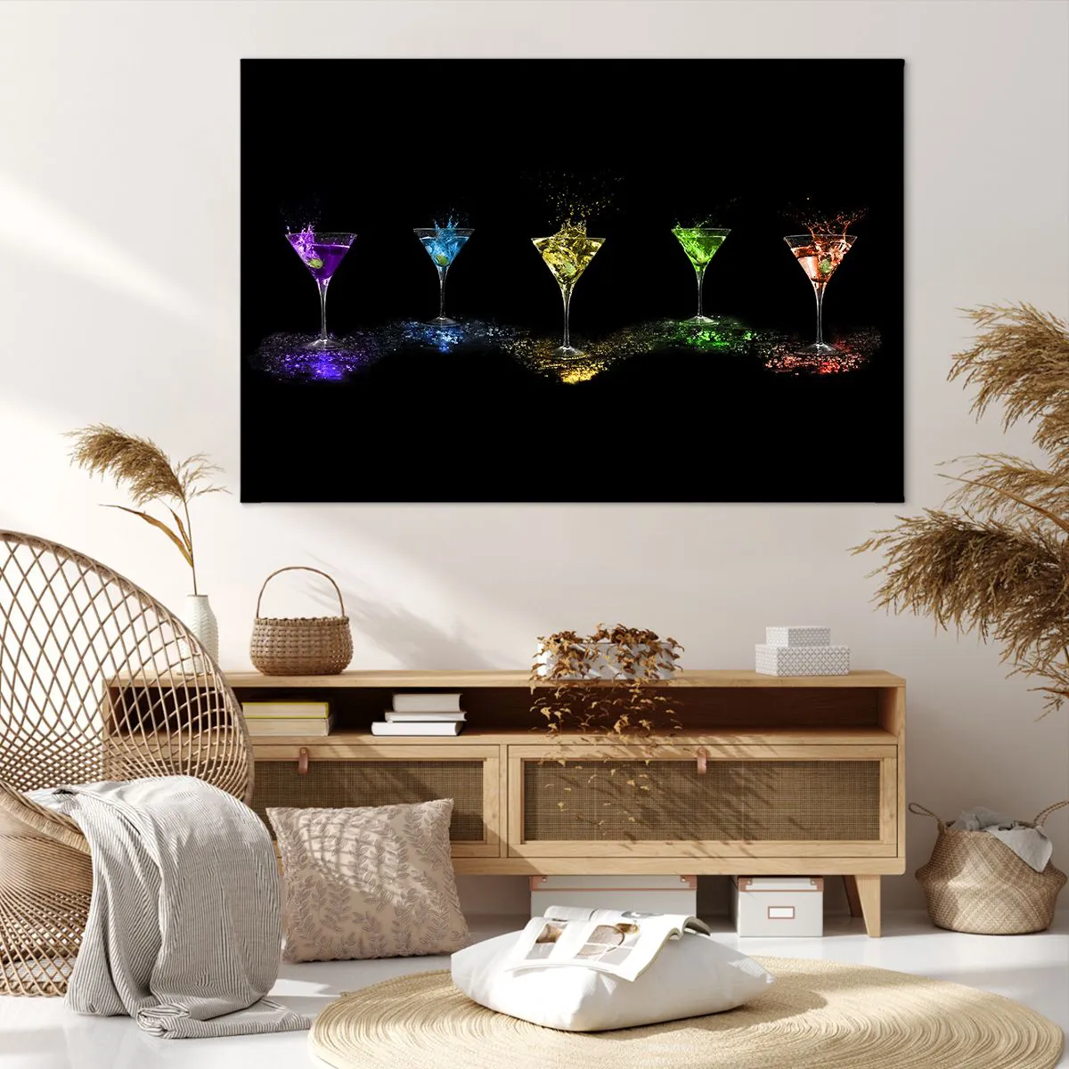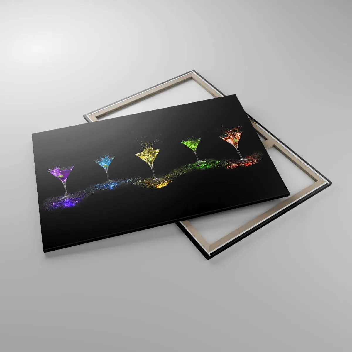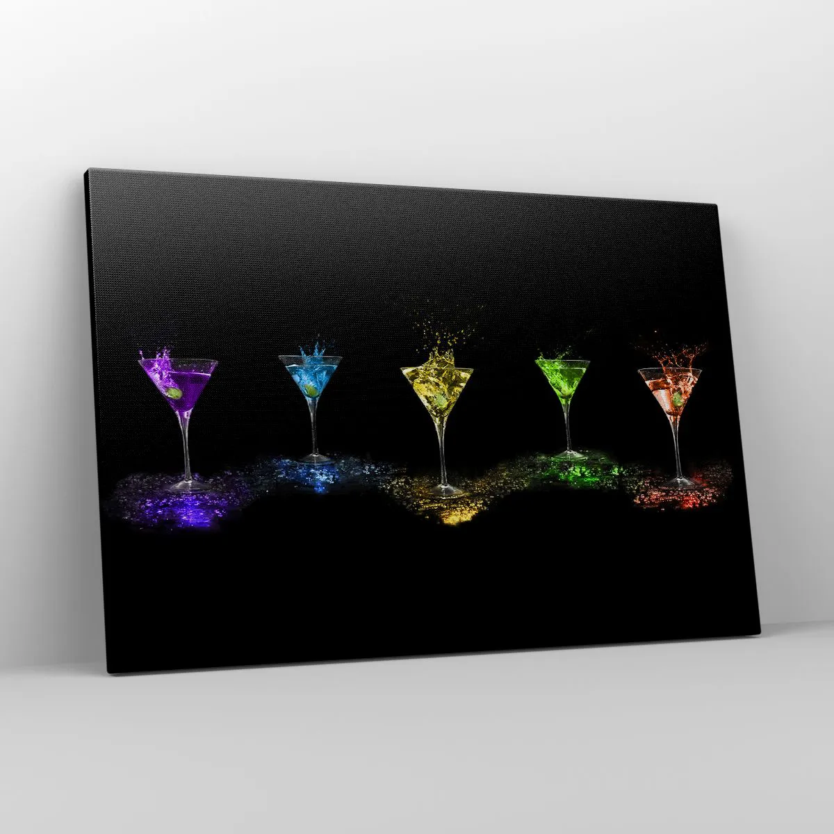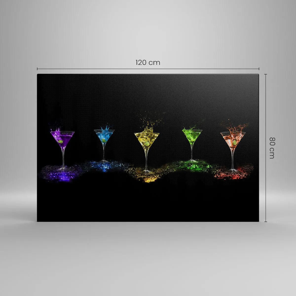 Bild auf Leinwand - Leinwandbild - Bunte Cocktails in Gläsern auf schwarzem Hintergrund - 120x80cm - Farben der Freude in Kristallglas - Moderne Wanddekoration für Wohnzimmer und Schlafzimmer ARTTOR