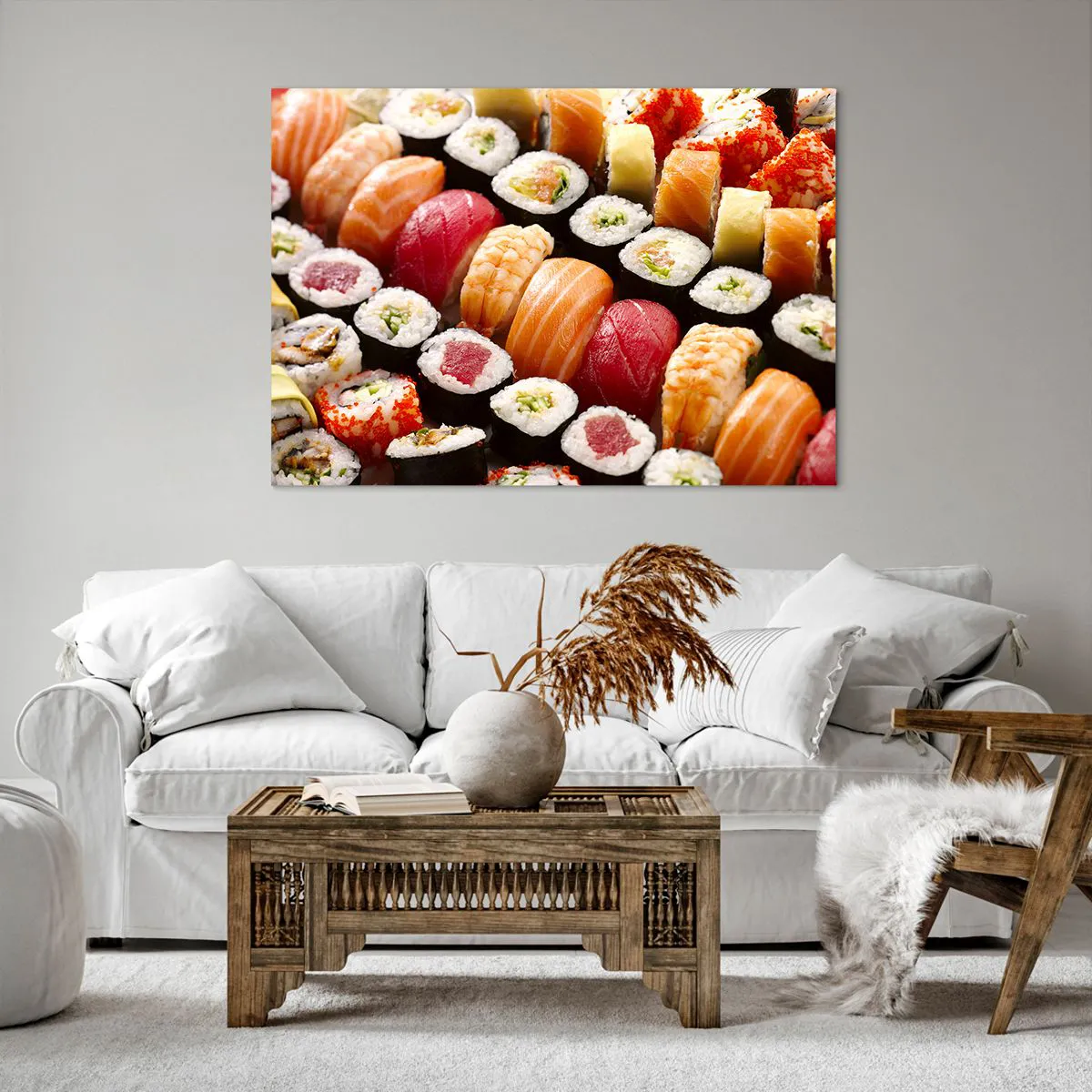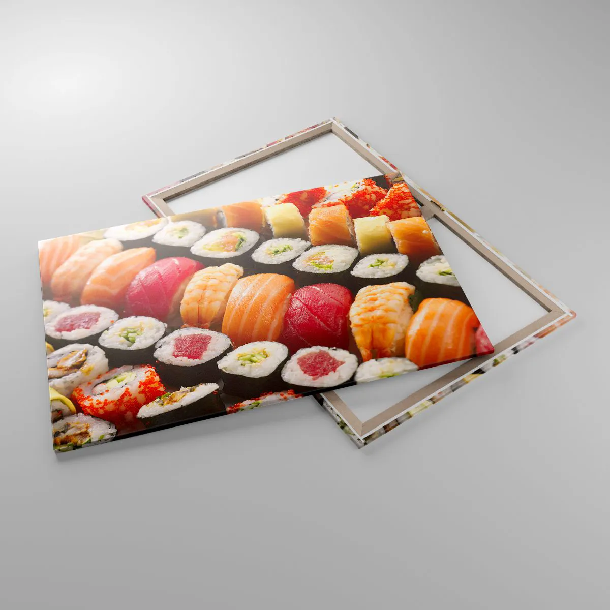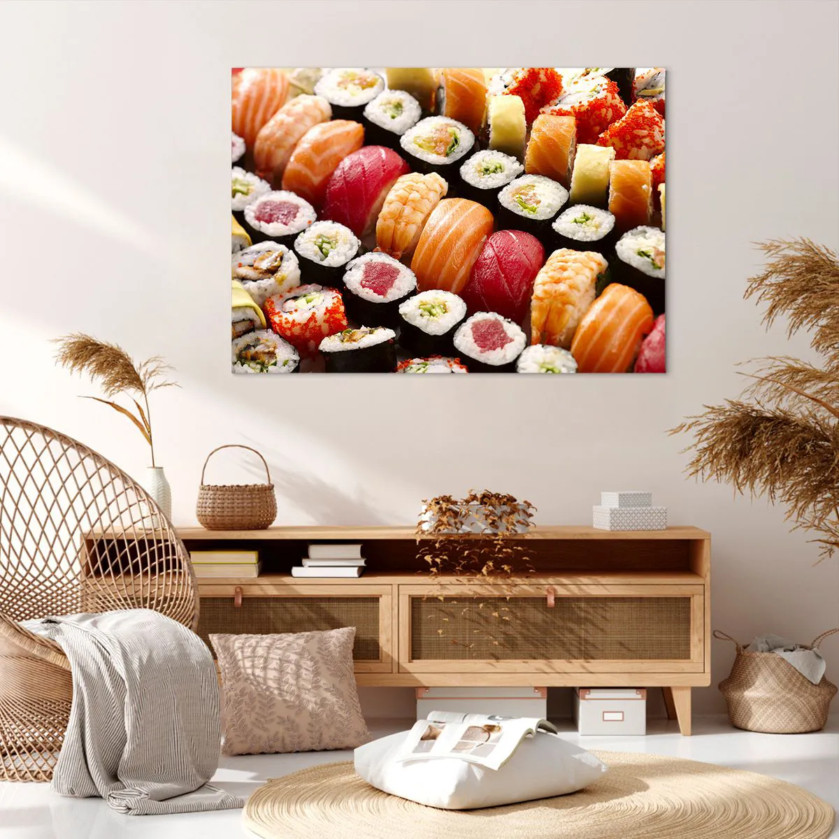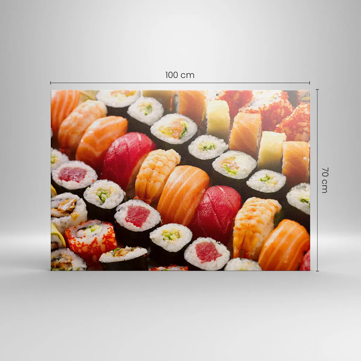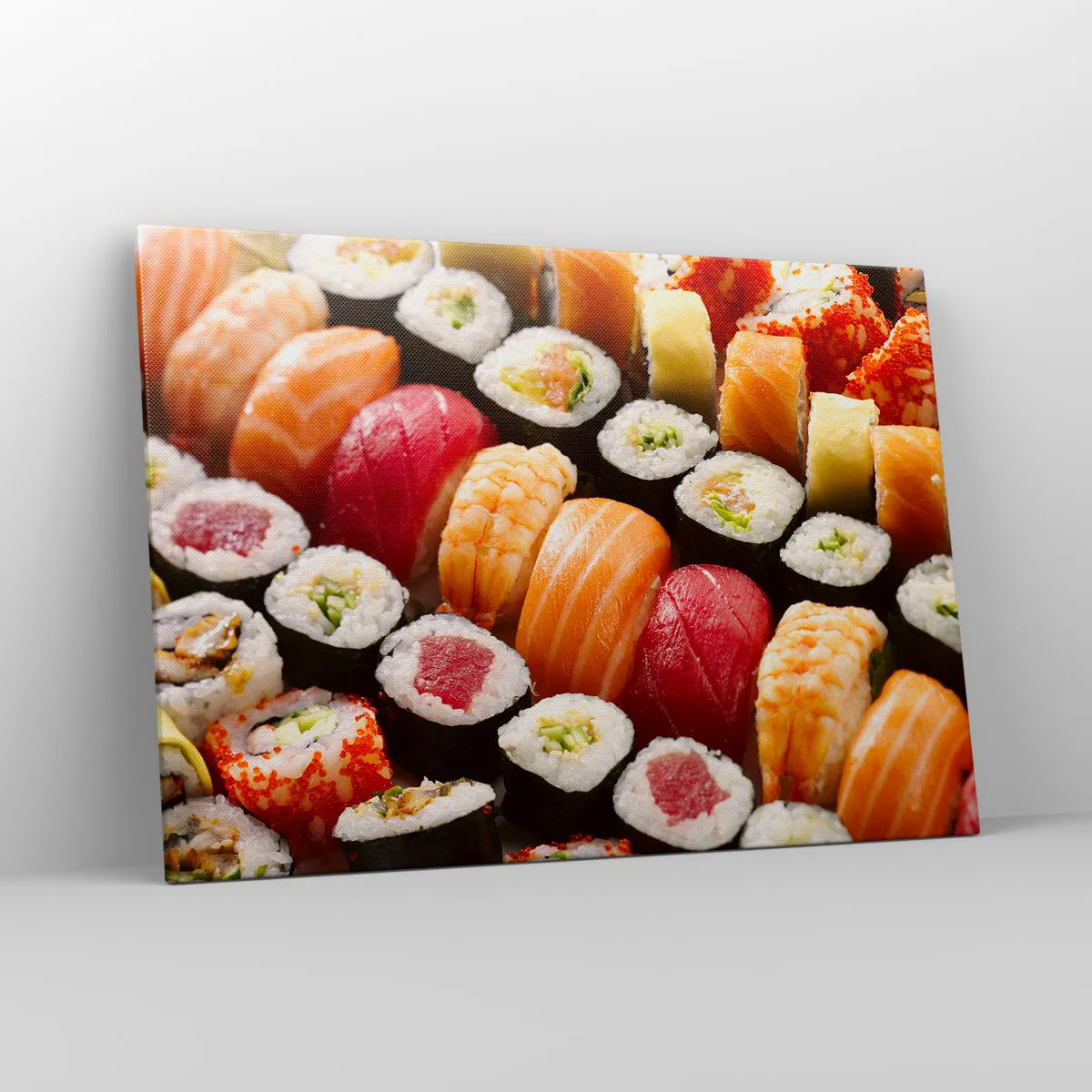 Bild auf Leinwand - Leinwandbild - Buntes Sushi in Reihen angeordnet mit verschiedenen Toppings - 100x70cm - Farben und Aromen Asiens - Moderne Wanddekoration für Wohnzimmer und Schlafzimmer ARTTOR