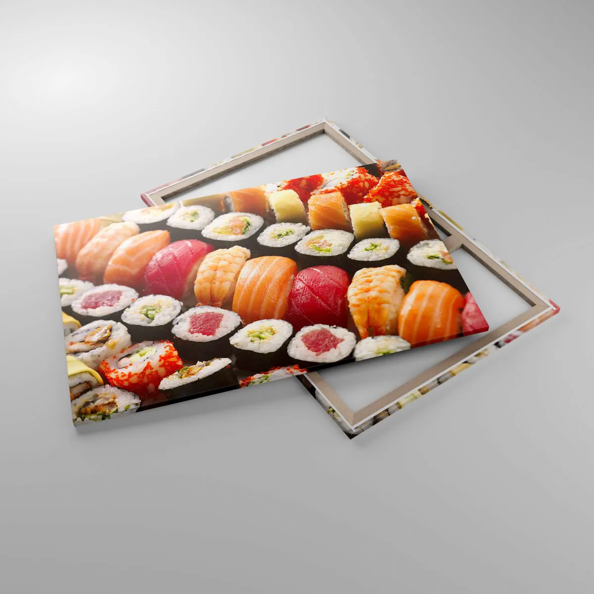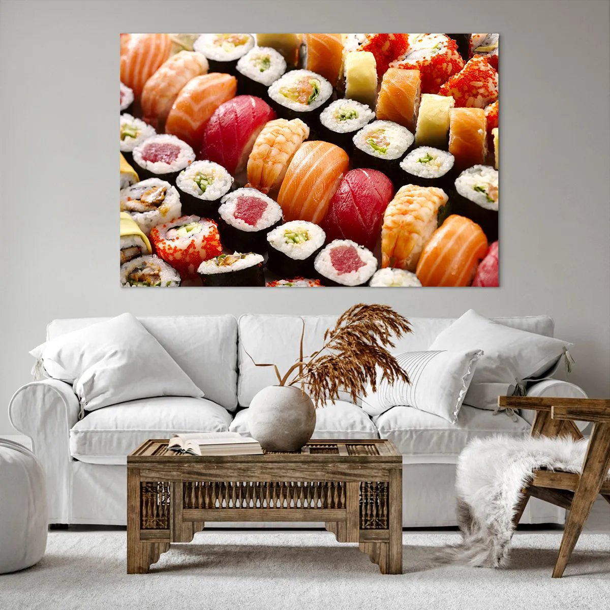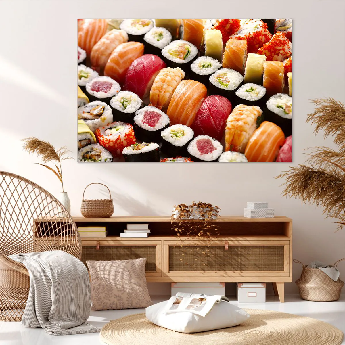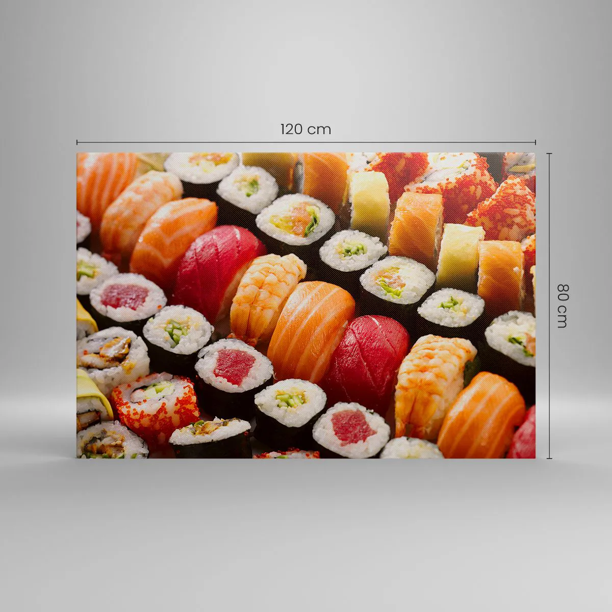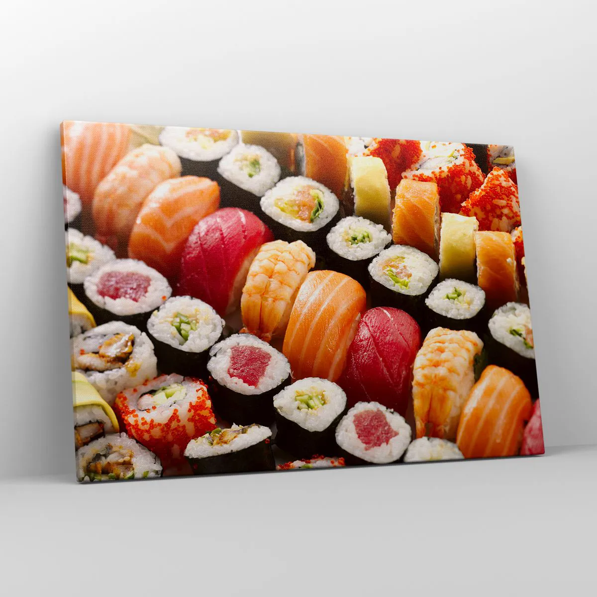 Bild auf Leinwand - Leinwandbild - Buntes Sushi in Reihen angeordnet mit verschiedenen Toppings - 120x80cm - Farben und Aromen Asiens - Moderne Wanddekoration für Wohnzimmer und Schlafzimmer ARTTOR