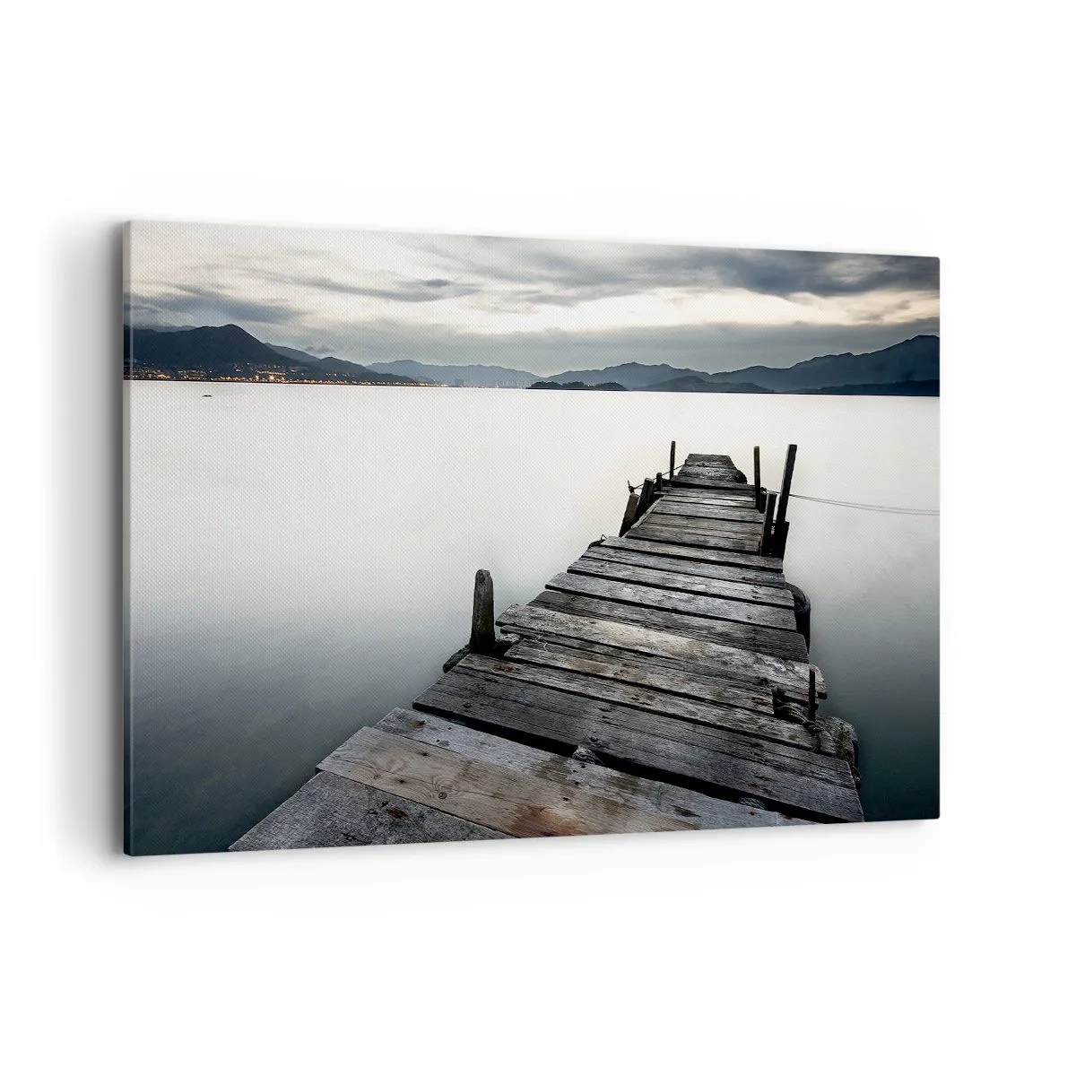 Bild auf Leinwand - Leinwandbild - Eine Holzbrücke, die zu einem ruhigen See führt - 120x80cm - Tauchen Sie ein in Ruhe - Moderne Wanddekoration für Wohnzimmer und Schlafzimmer ARTTOR