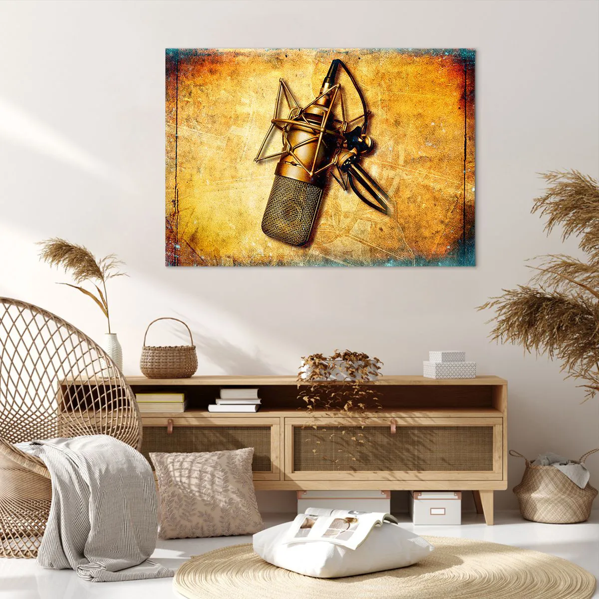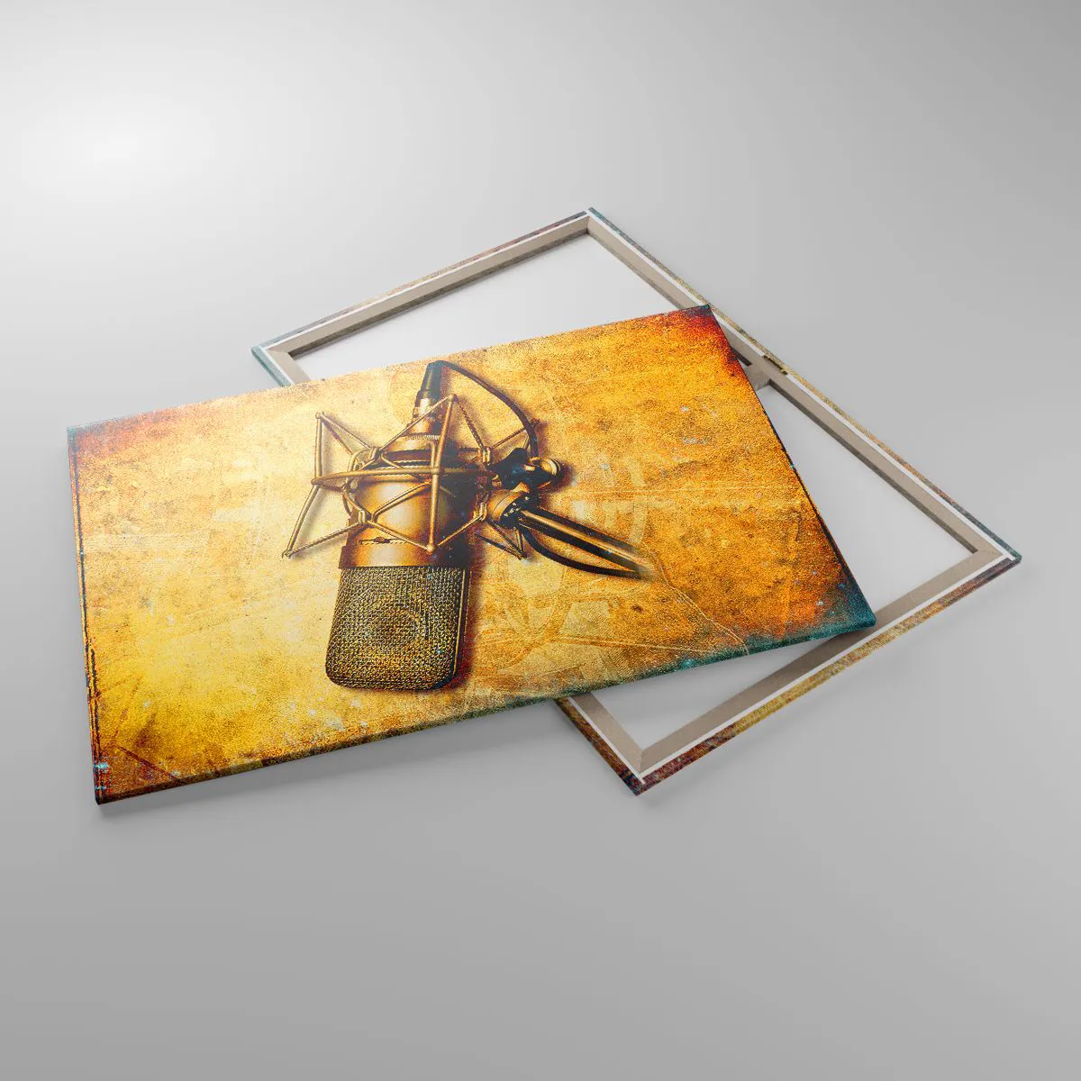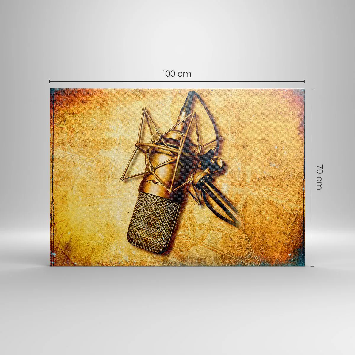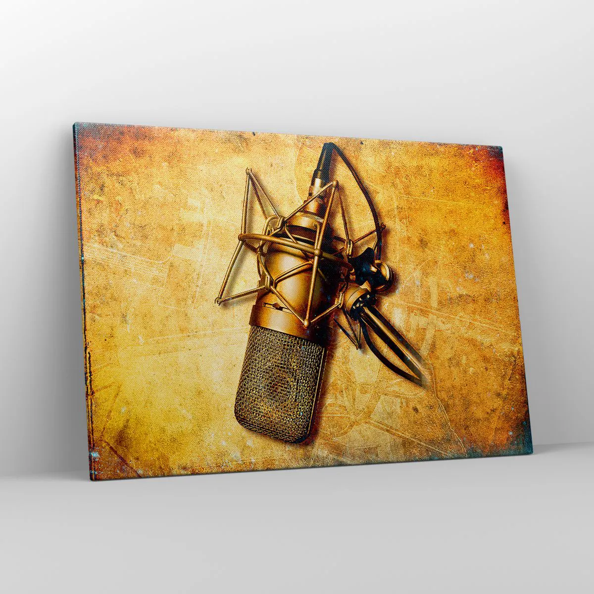 Bild auf Leinwand - Leinwandbild - Ein goldenes Studiomikrofon vor einem Vintage-Hintergrund in warmen Tönen. - 100x70cm - Die goldenen Jahre des Radios - Moderne Wanddekoration für Wohnzimmer und Schlafzimmer ARTTOR
