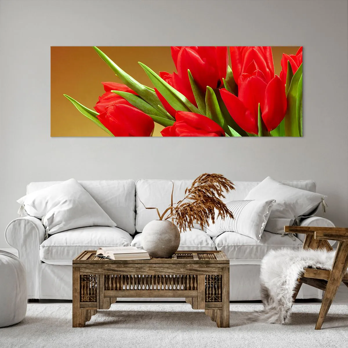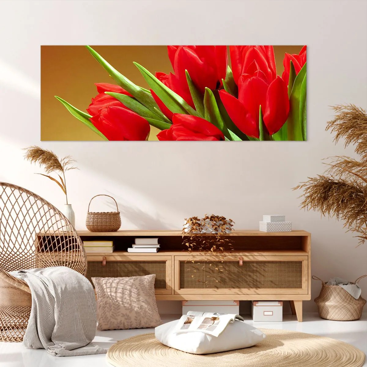 Bild auf Leinwand - Leinwandbild - Ein Strauß roter Tulpen auf goldenem Hintergrund mit grünen Blättern. - 140x50cm - Ein Haufen Frühlingsfreude - Moderne Wanddekoration für Wohnzimmer und Schlafzimmer ARTTOR