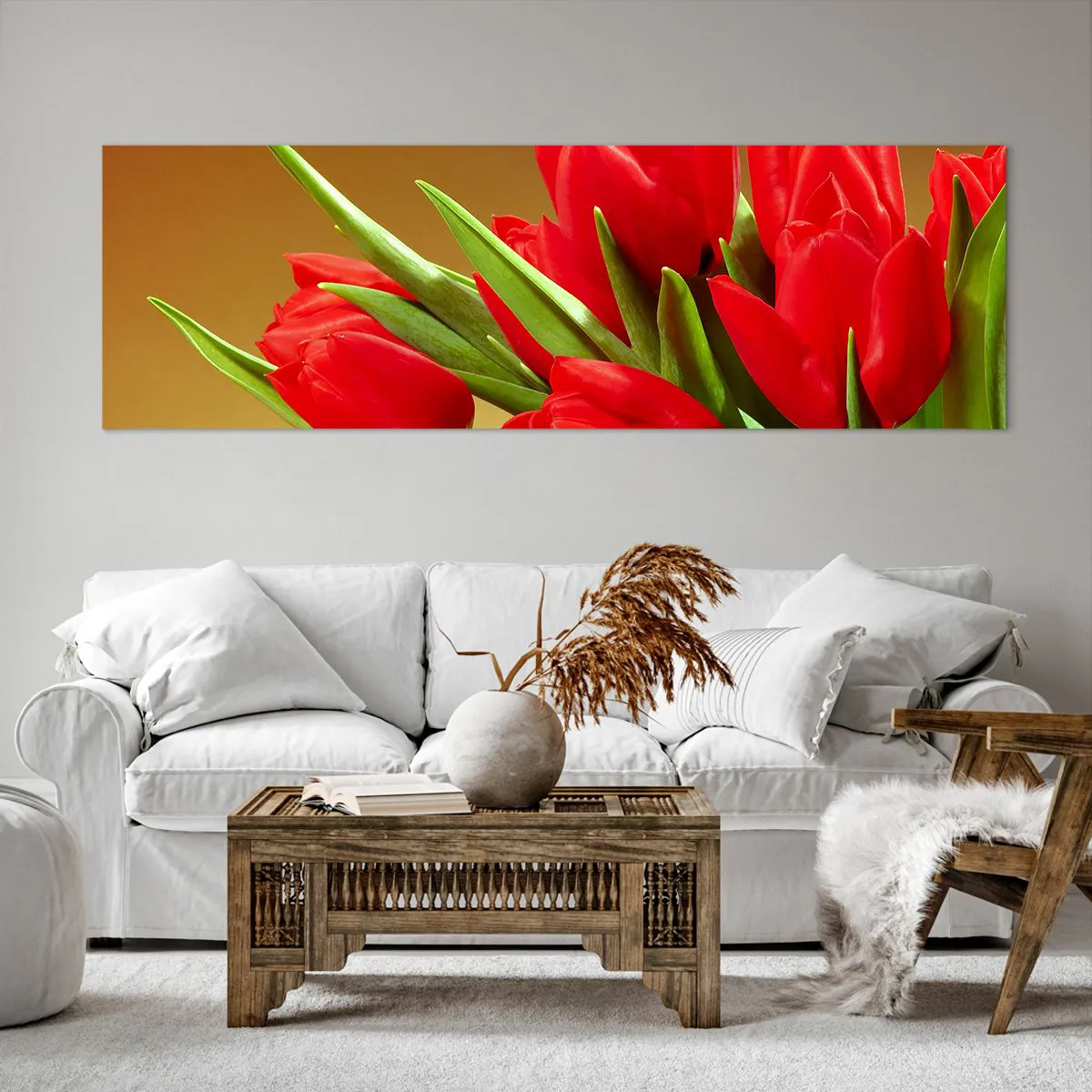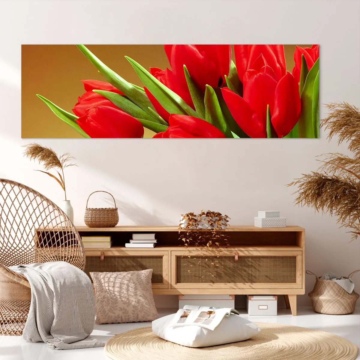 Bild auf Leinwand - Leinwandbild - Ein Strauß roter Tulpen auf goldenem Hintergrund mit grünen Blättern. - 160x50cm - Ein Haufen Frühlingsfreude - Moderne Wanddekoration für Wohnzimmer und Schlafzimmer ARTTOR