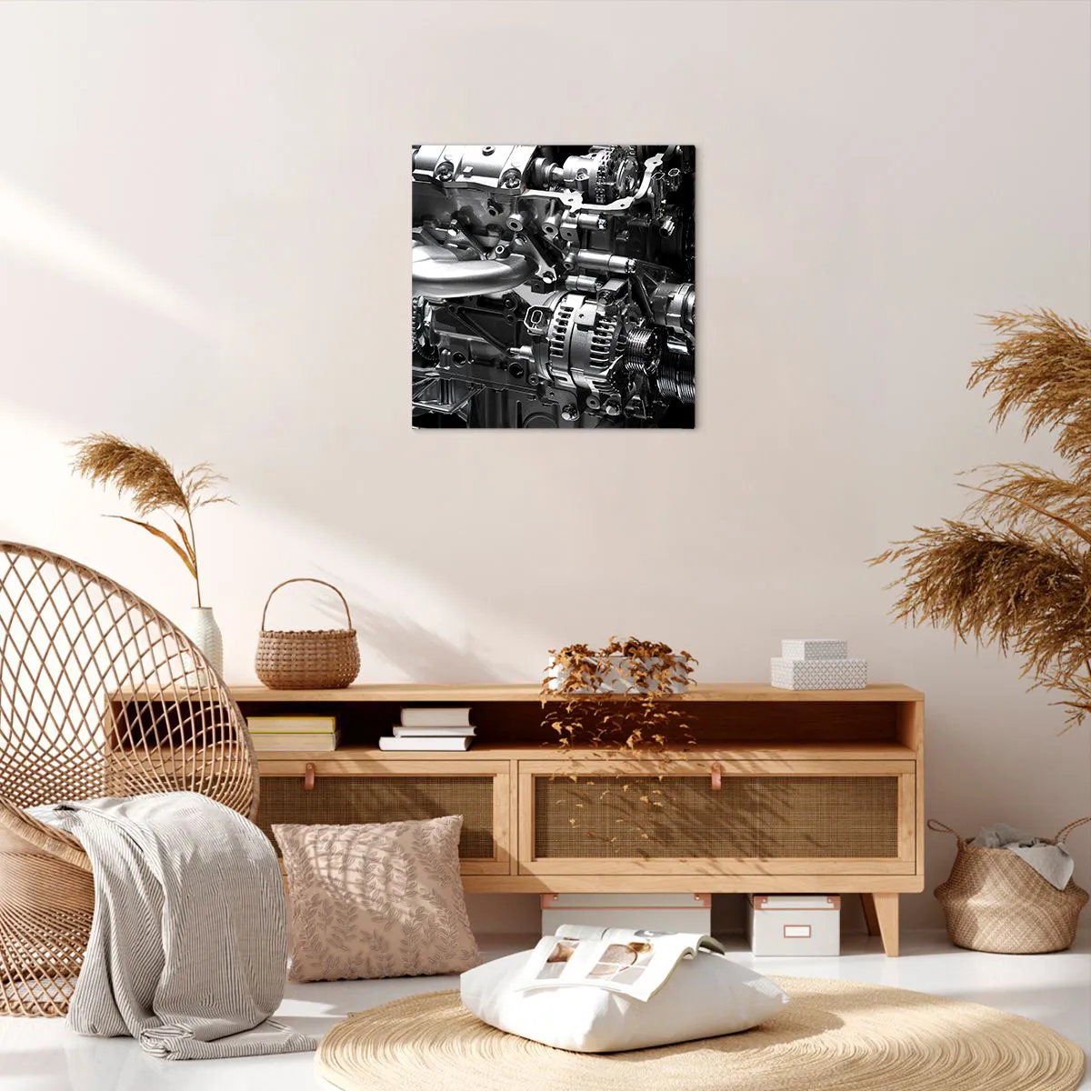 Die Leinwand wird über den Rahmen gespannt. Die Seiten und Kanten werden gedruckt, um das Bild fortzusetzen. Das Bild ist fertig zum Aufhängen an der Wand. Jedes Produkt hat einen am Rahmen befestigten Anhänger und ein Montageset (Schraube + Stift).