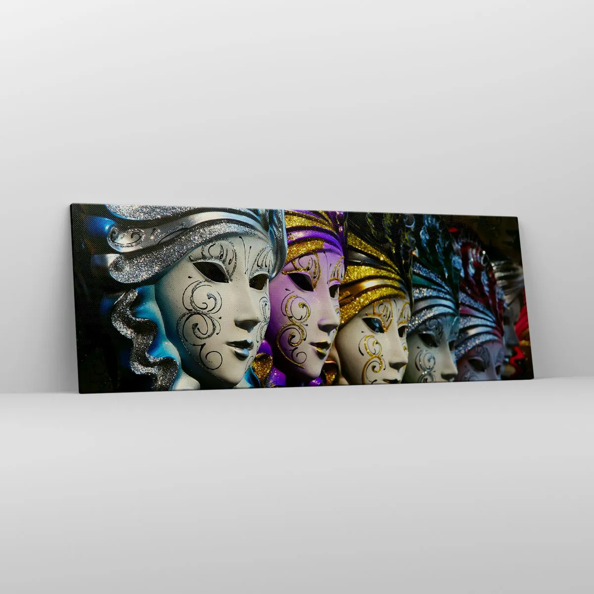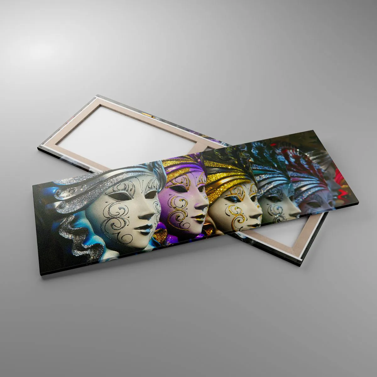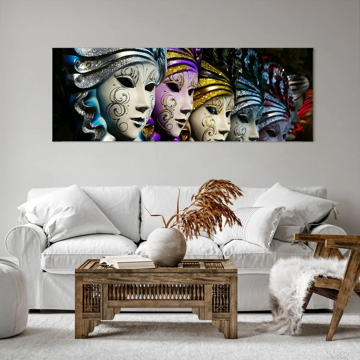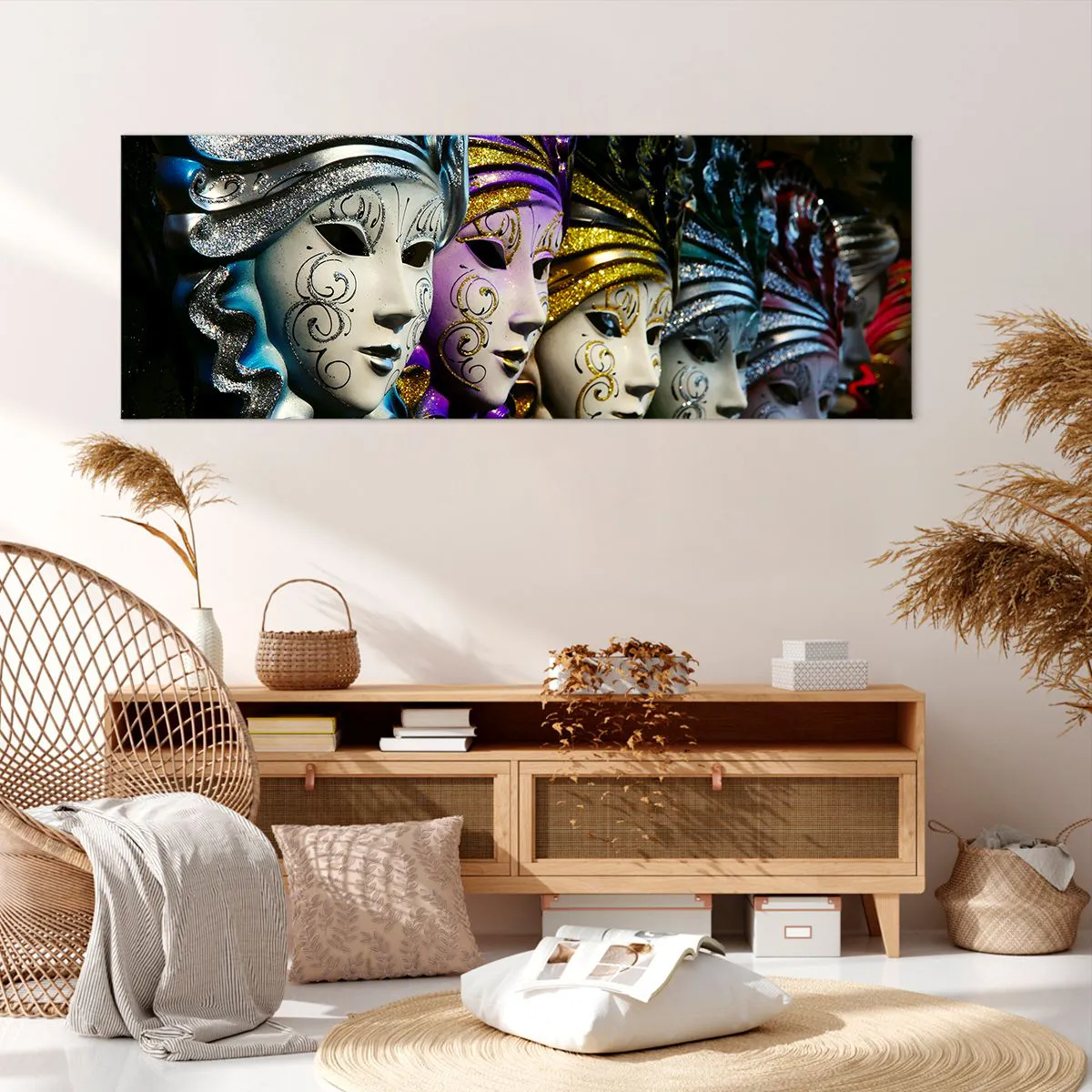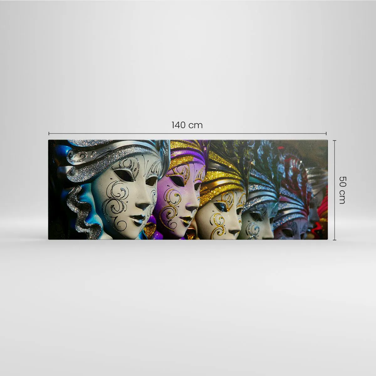 Bild auf Leinwand - Leinwandbild - Venezianische Masken in verschiedenen Farben mit dekorativen Mustern - 140x50cm - Geheimnis in Gold und Silber - Moderne Wanddekoration für Wohnzimmer und Schlafzimmer ARTTOR
