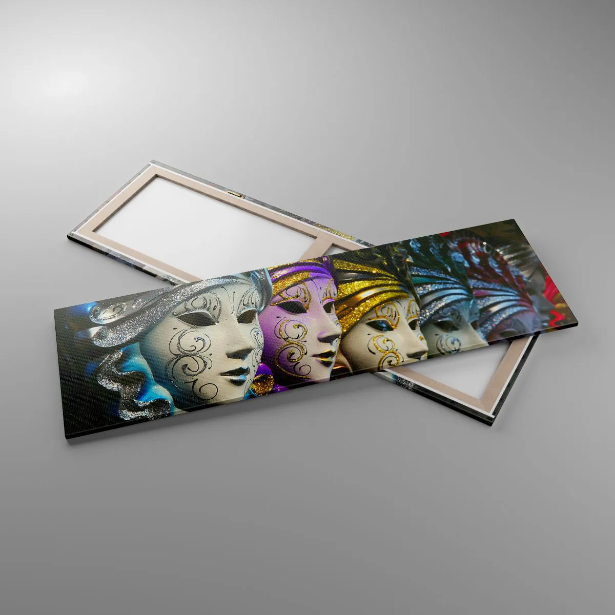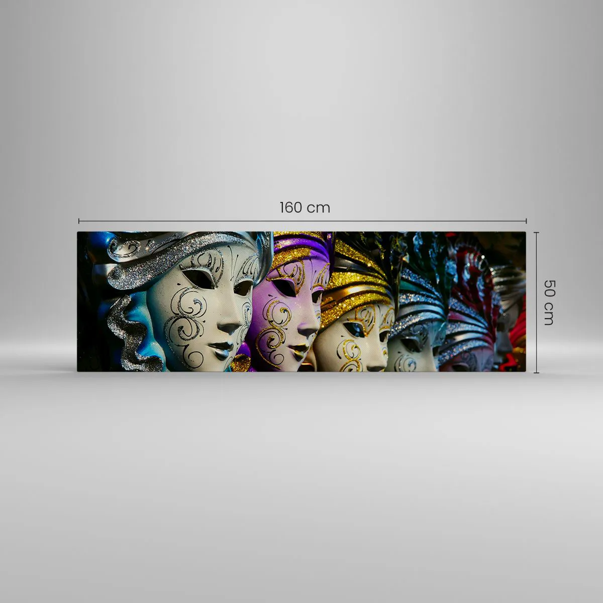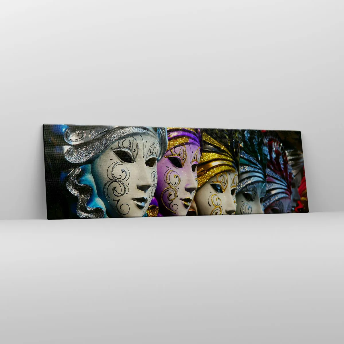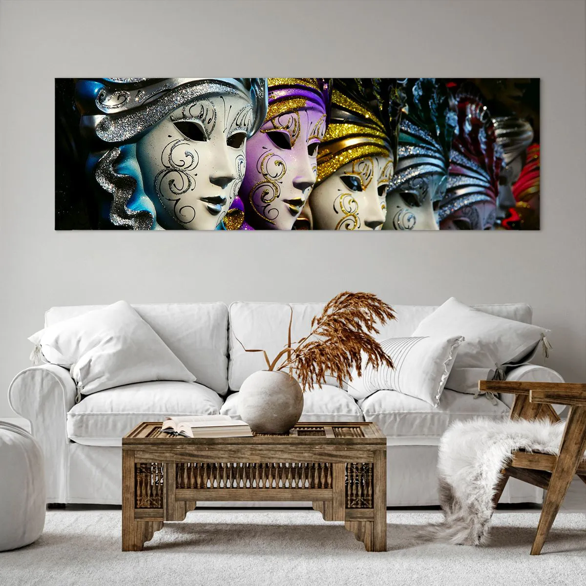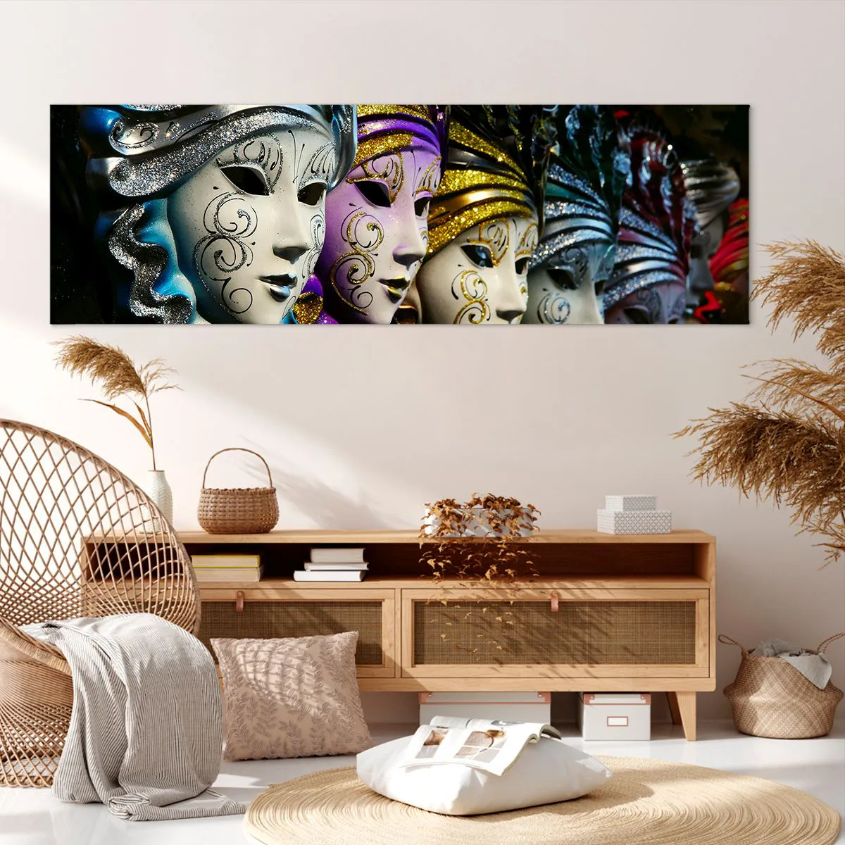 Bild auf Leinwand - Leinwandbild - Venezianische Masken in verschiedenen Farben mit dekorativen Mustern - 160x50cm - Geheimnis in Gold und Silber - Moderne Wanddekoration für Wohnzimmer und Schlafzimmer ARTTOR