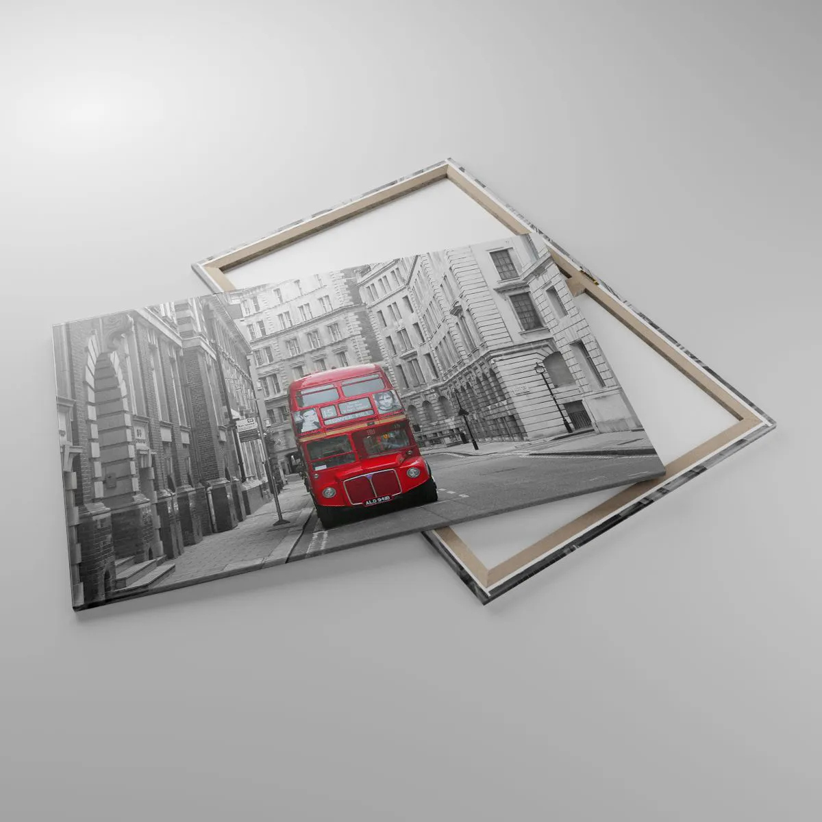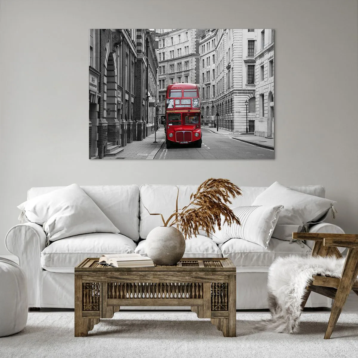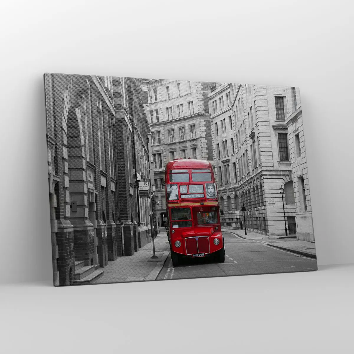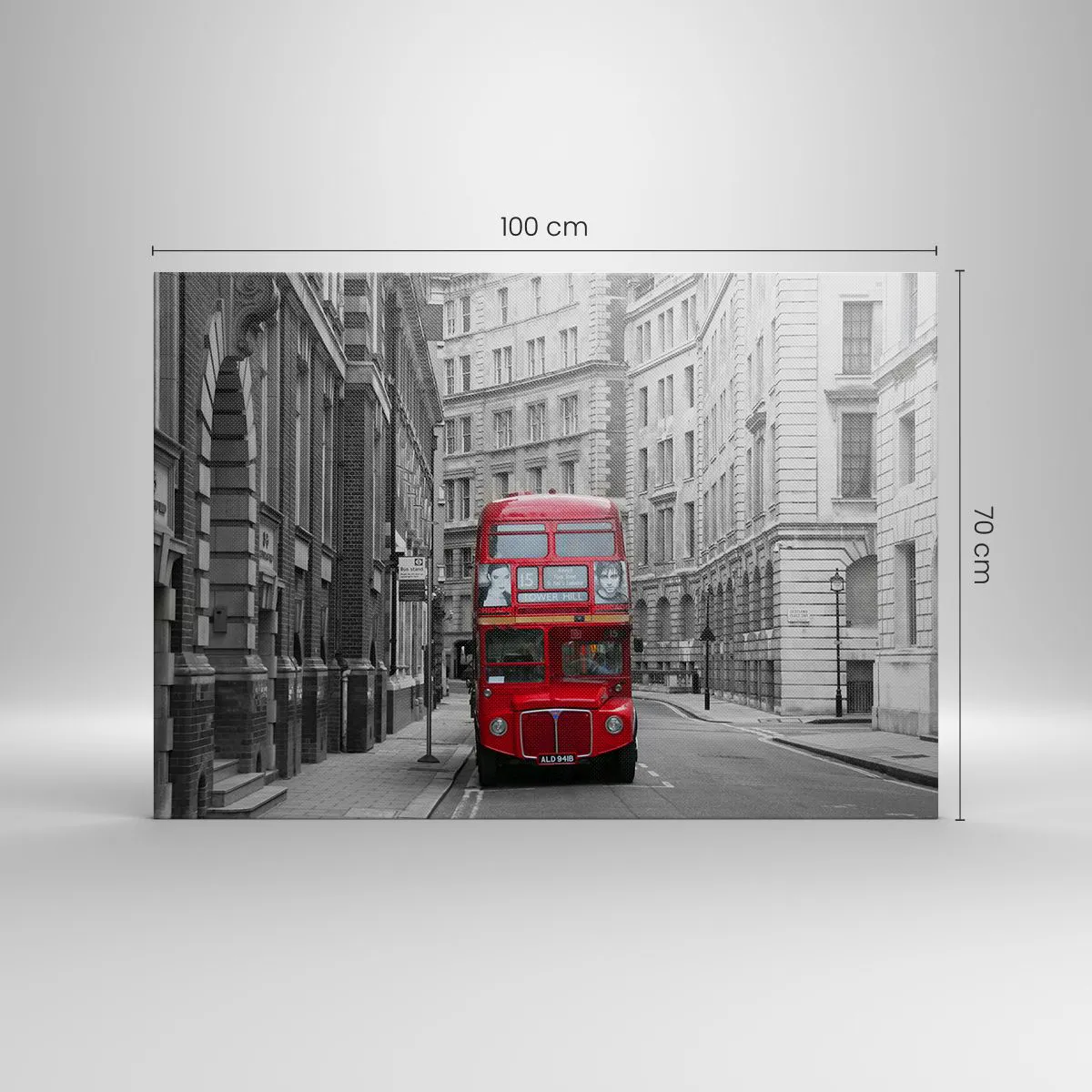 Bild auf Leinwand - Leinwandbild - Ein roter Bus vor einem Hintergrund aus schwarz-weißen Stadtgebäuden. - 100x70cm - Der Alltag muss nicht grau sein - Moderne Wanddekoration für Wohnzimmer und Schlafzimmer ARTTOR