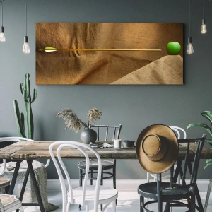 Bild auf Leinwand - Leinwandbild - Grüner Apfel auf Stoff mit einem Pfeil, der eine Komposition ergibt - 140x50cm - Beschwöre den Geist von Wilhelm Tell - Moderne Wanddekoration für Wohnzimmer und Schlafzimmer ARTTOR