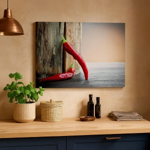 „Rote scharfe Chilischoten“ ist ein Originalgemälde auf Leinwand, das zwei rote Chilischoten auf einem rustikalen Holzhintergrund zeigt. Das intensive Rot der Schoten kontrastiert mit den natürlichen Farbtönen des Holzes und verleiht dem Gemälde einen unverwechselbaren und warmen Charakter. Dieses Motiv passt perfekt in eine Küche oder ein Esszimmer und verleiht dem Interieur Frische und Energie.