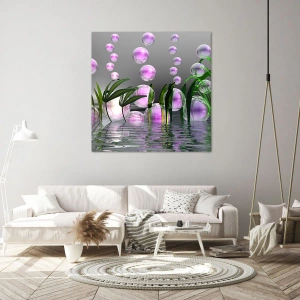 Bild auf Leinwand - Leinwandbild - Grüne Blätter und rosa Blasen über dem Wasser auf grauem Hintergrund - 70x50cm - Eine reflektierende Komposition aus Leichtigkeit und Leben - Moderne Wanddekoration für Wohnzimmer und Schlafzimmer ARTTOR