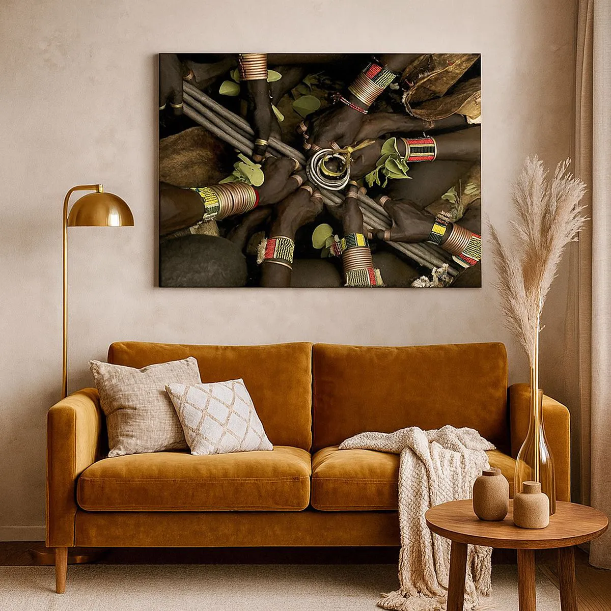 • Das Gemälde zeigt eine Nahaufnahme einer Gruppe von Händen, die mit traditionellen Armbändern geschmückt sind, die Kultur und Harmonie symbolisieren. Eine ausgezeichnete Wahl für Innenräume, die von Exotik und Tradition inspiriert sind.