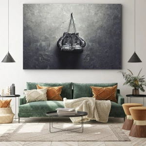Bild auf Leinwand - Leinwandbild - Alte Boxhandschuhe an der Wand - 160x50cm - Zeit des Kampfes und Zeit des Friedens - Moderne Wanddekoration für Wohnzimmer und Schlafzimmer ARTTOR