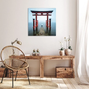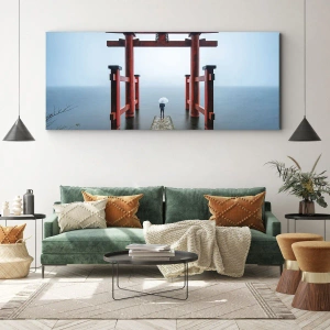 Bild auf Leinwand - Leinwandbild - Ein Torii-Tor mit Blick auf einen ruhigen See in Japan - 120x50cm - Japanische Träumerei - Moderne Wanddekoration für Wohnzimmer und Schlafzimmer ARTTOR