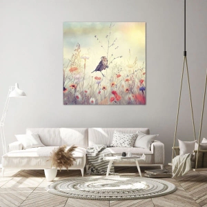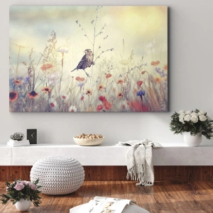 Bild auf Leinwand - Leinwandbild - Vogelporträt mit einer Wiese im Hintergrund - 55x100 cm