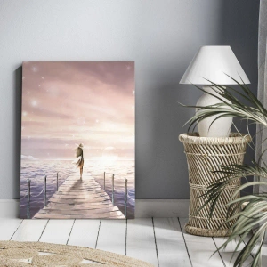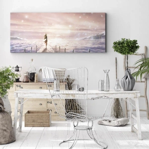 Bild auf Leinwand - Leinwandbild - Eine Frau auf einem Steg in einer magischen Sonnenuntergangskulisse - 140x50cm - Im Licht eines Traums - Moderne Wanddekoration für Wohnzimmer und Schlafzimmer ARTTOR