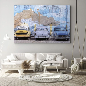 - Ein Gemälde in Blau- und Gelbtönen zeigt alte Autos, die vor einer verfallenen Wand geparkt sind. Das Retro-Motiv verleiht dem Interieur einen industriellen Stil und ein historisches Flair.
