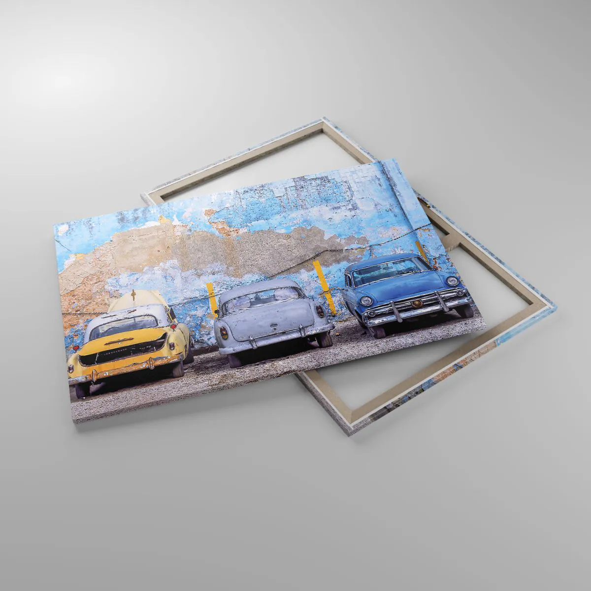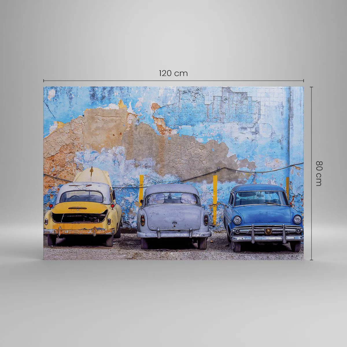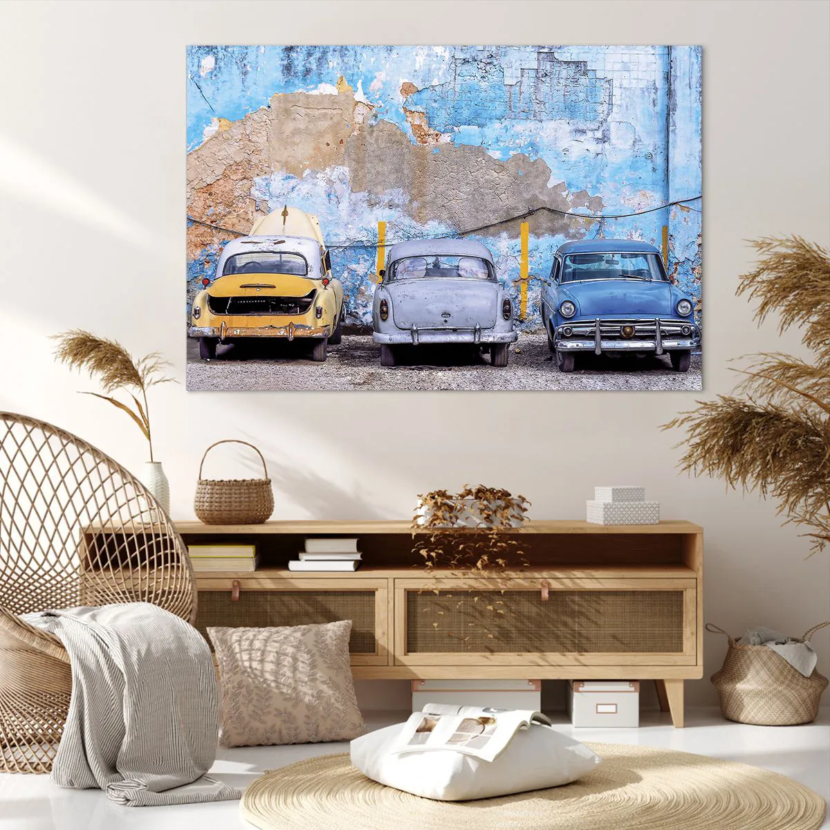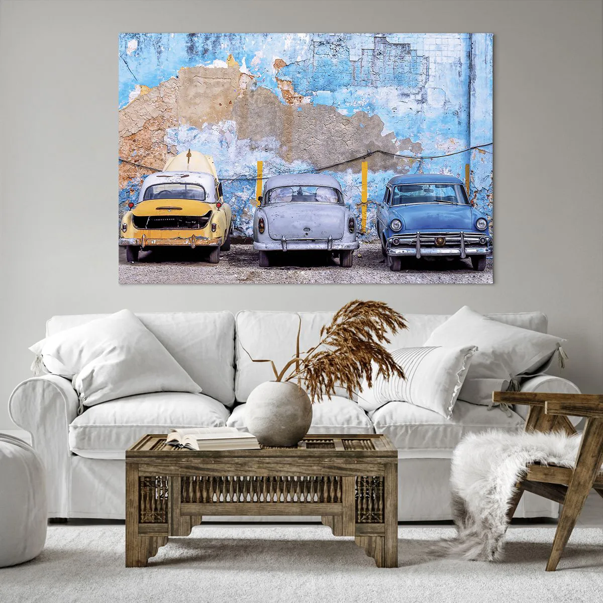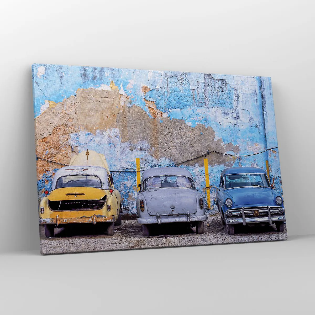 Bild auf Leinwand - Leinwandbild - Alte Autos vor dem Hintergrund einer zerstörten Mauer - 120x80cm - Treffen der Veteranen - Moderne Wanddekoration für Wohnzimmer und Schlafzimmer ARTTOR