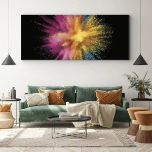 - Dieser 70 x 50 cm große Leinwanddruck zeigt eine dynamische, farbenfrohe Pulverexplosion vor schwarzem Hintergrund. Eine auffällige Dekoration, die jedem Interieur Energie und Modernität verleiht.