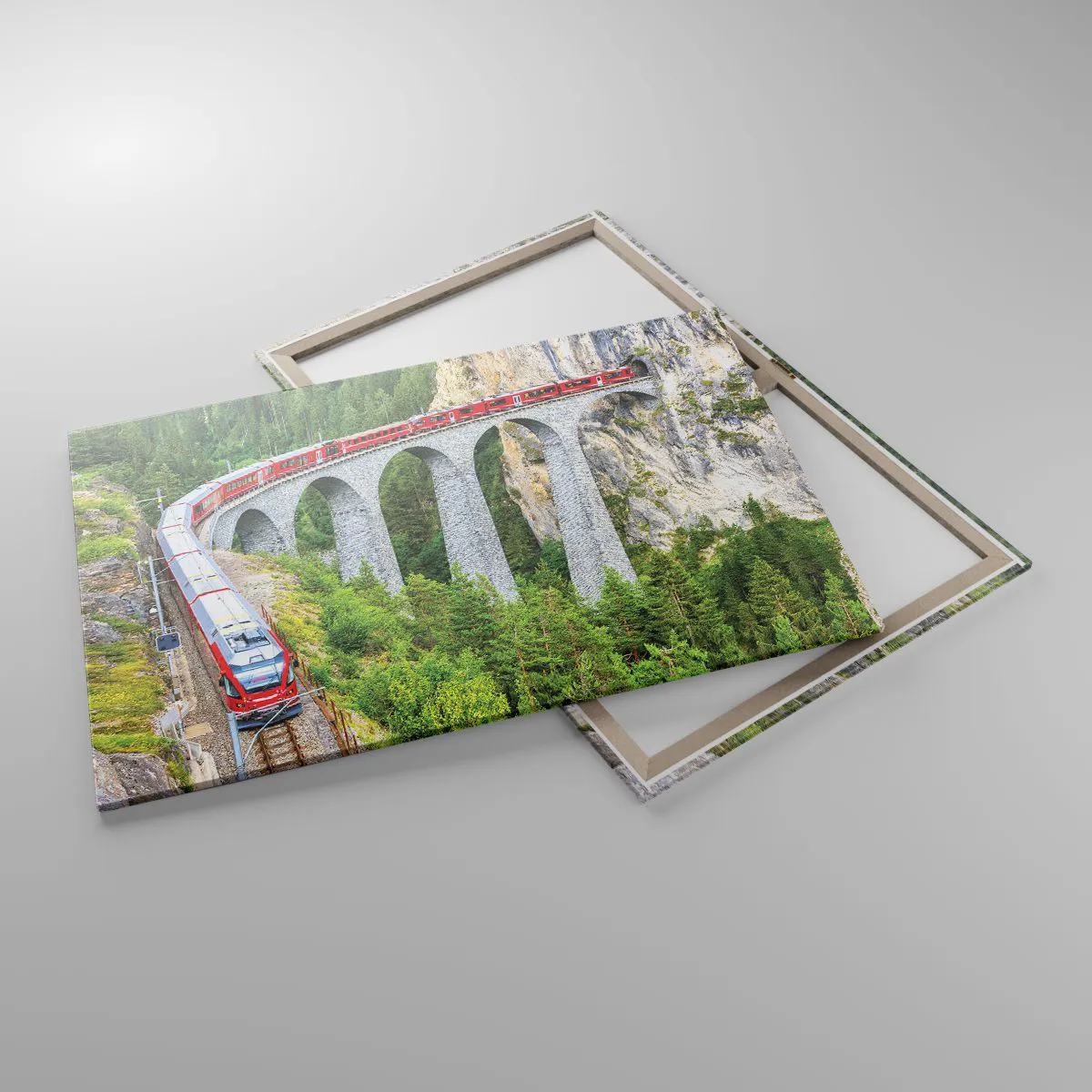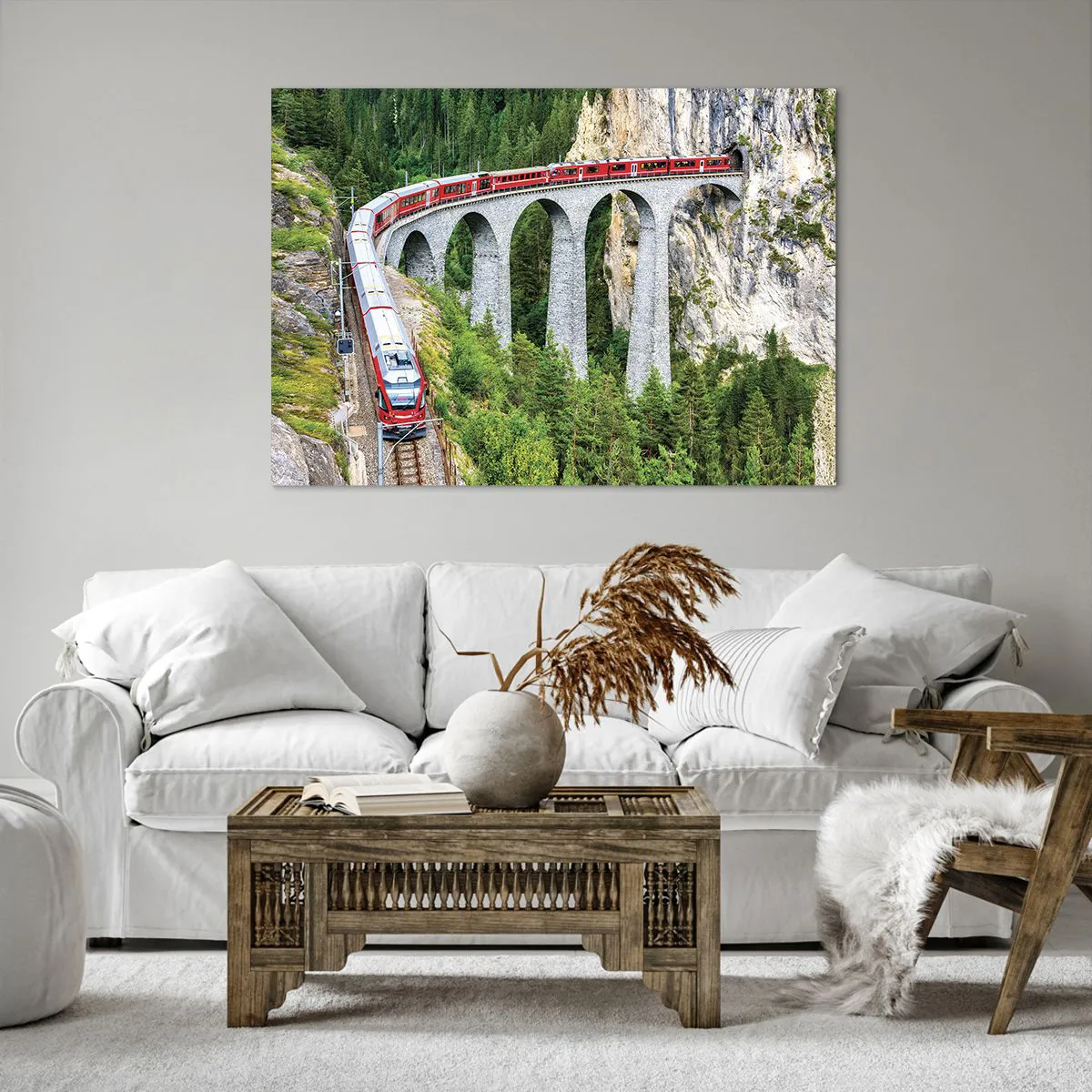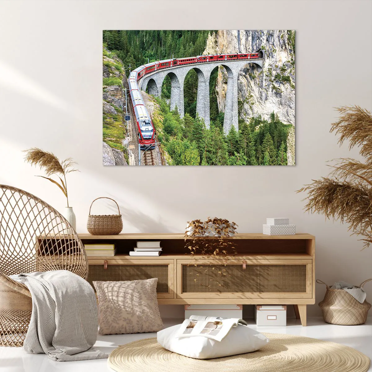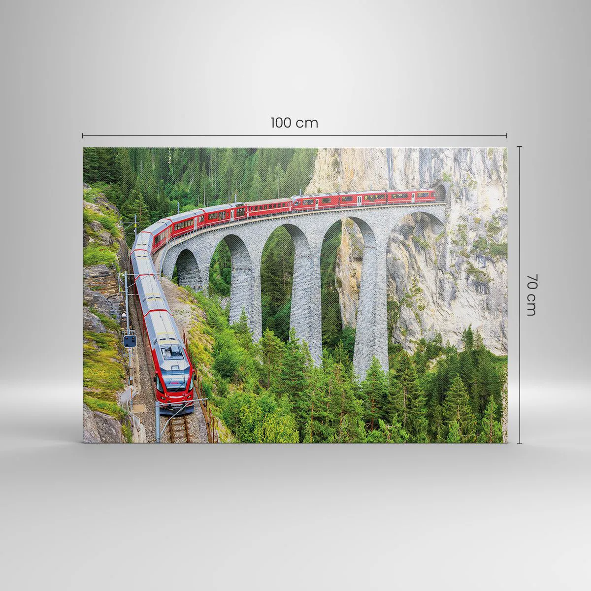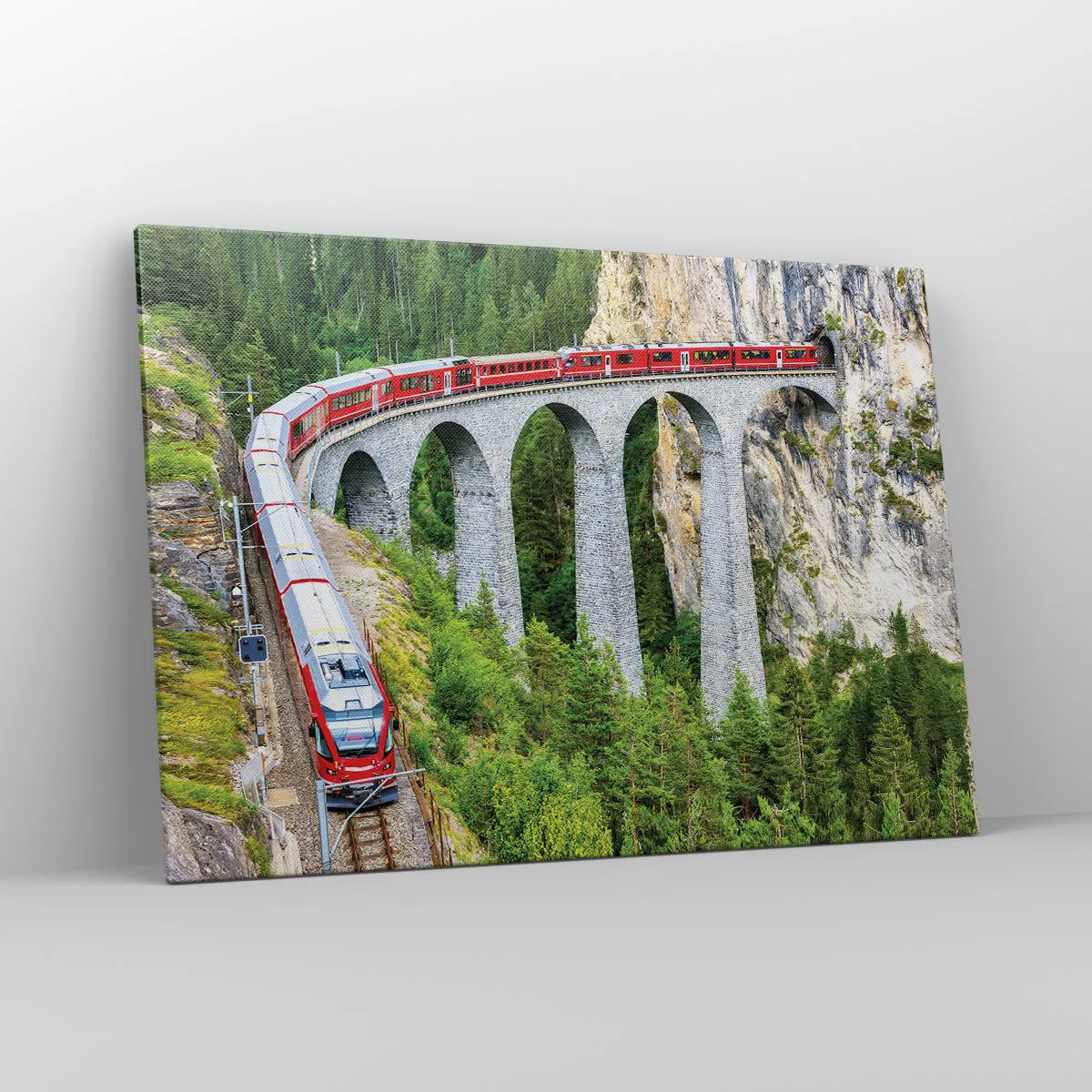 Bild auf Leinwand - Leinwandbild - Ein Zug auf einem malerischen Viadukt in einer Berglandschaft - 100x70cm - Eisenbahn für Bergblick - Moderne Wanddekoration für Wohnzimmer und Schlafzimmer ARTTOR