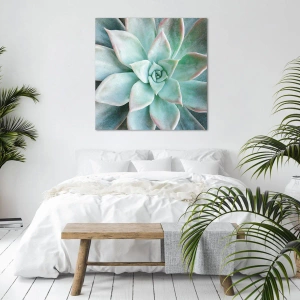 - Das Gemälde zeigt eine Nahaufnahme einer grünen Sukkulente, deren Blätter in einer harmonischen Komposition angeordnet sind. Perfekt für Liebhaber der Natur und minimalistischer Innenräume.