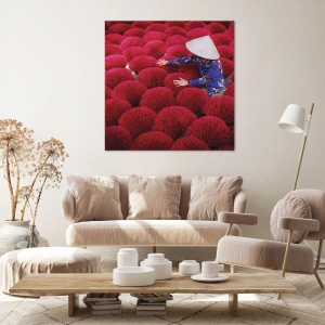 Bild auf Leinwand - Leinwandbild - Eine Frau mit traditionellem Hut zwischen roten Räucherstäbchen - 140x50cm - Im Reisfeld - Moderne Wanddekoration für Wohnzimmer und Schlafzimmer ARTTOR