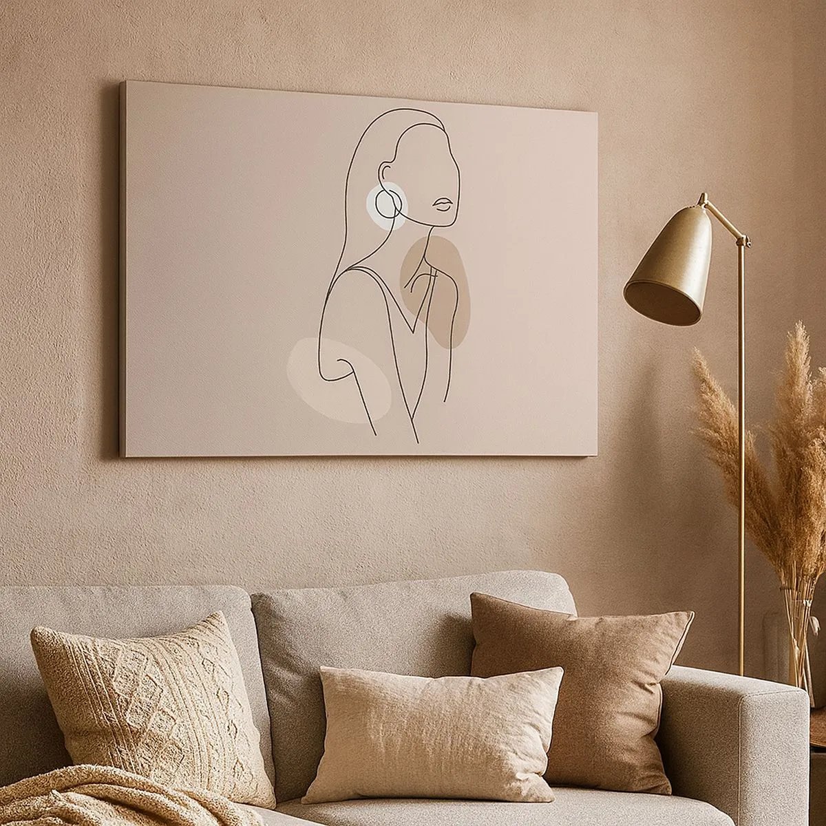 Bild auf Leinwand - Leinwandbild - Minimalistische Illustration einer Frau mit Umrissen auf beigem Hintergrund - 70x50cm - Mädchenhafte Ikone - Moderne Wanddekoration für Wohnzimmer und Schlafzimmer ARTTOR