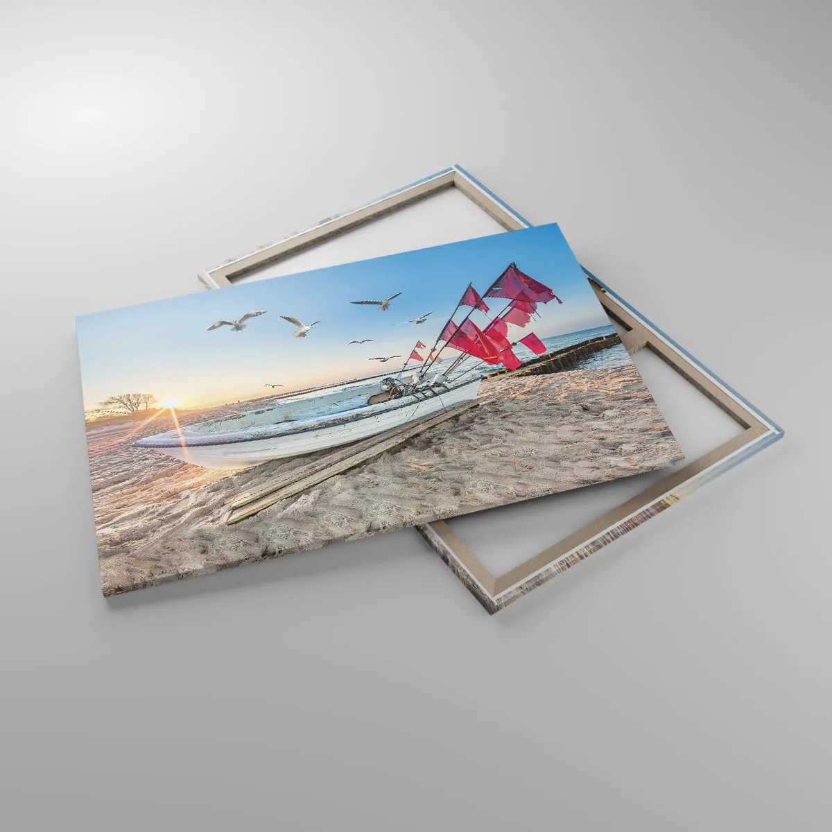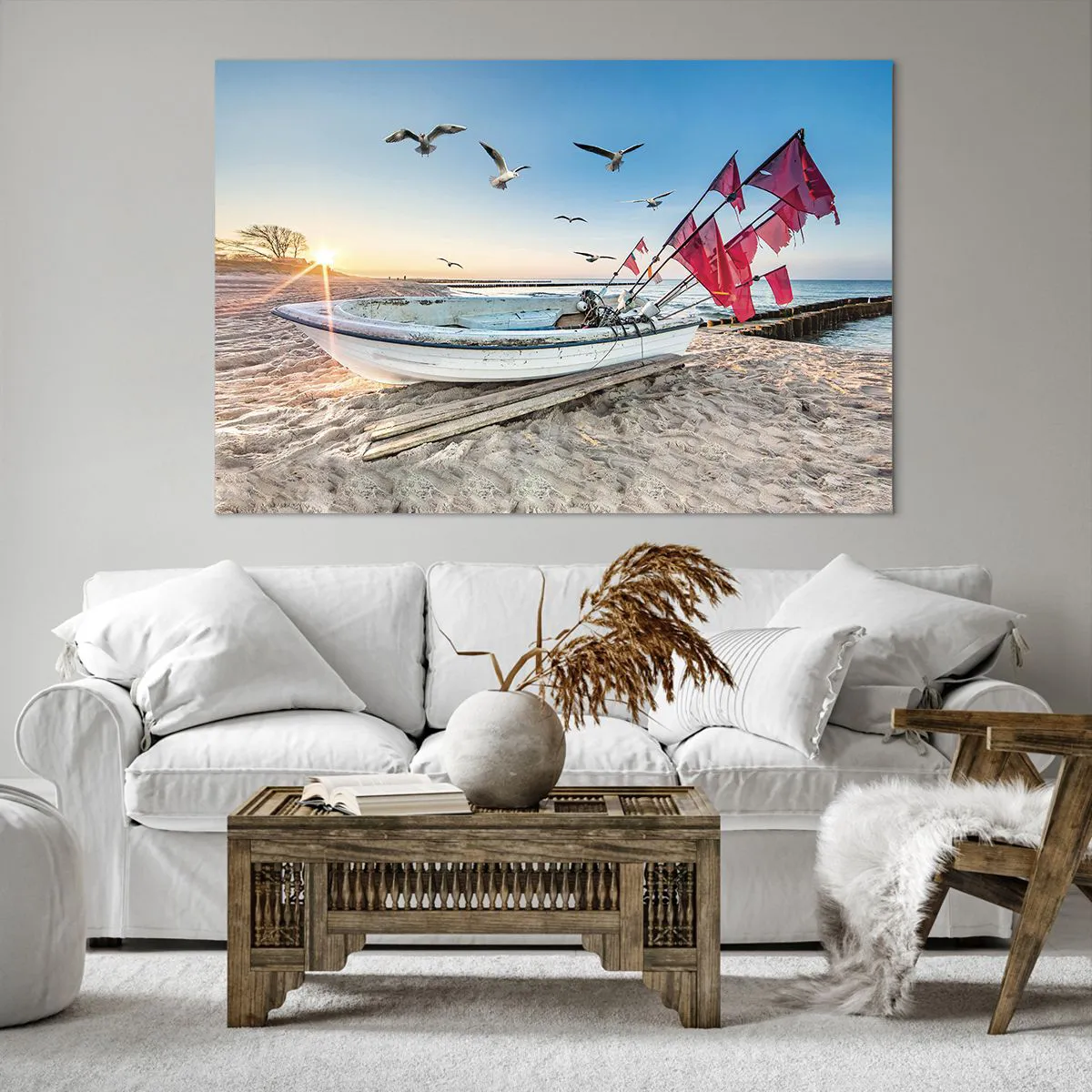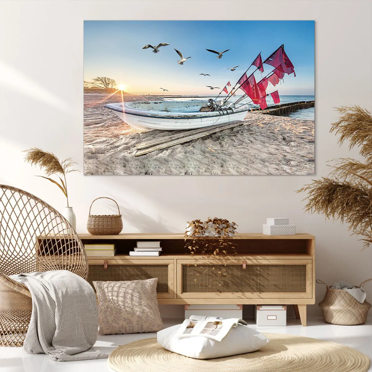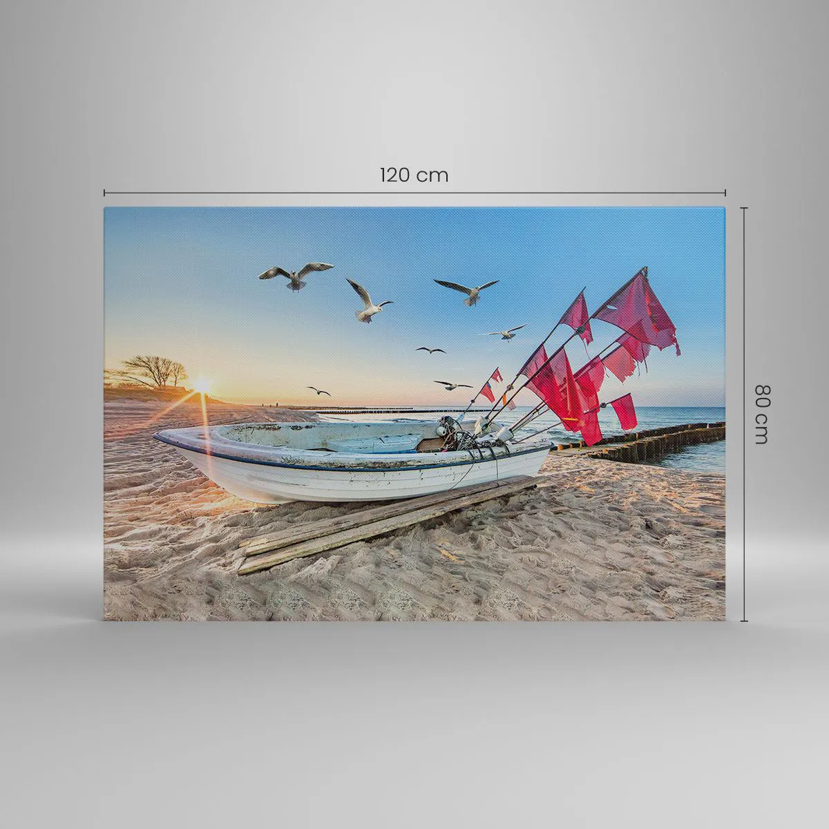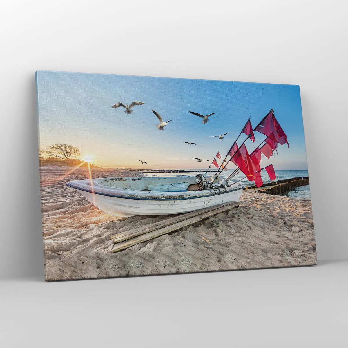 Bild auf Leinwand - Leinwandbild - Ein Boot am Strand im Morgengrauen mit Möwen und roten Fahnen - 120x80cm - Wohlverdiente Ruhe - Moderne Wanddekoration für Wohnzimmer und Schlafzimmer ARTTOR