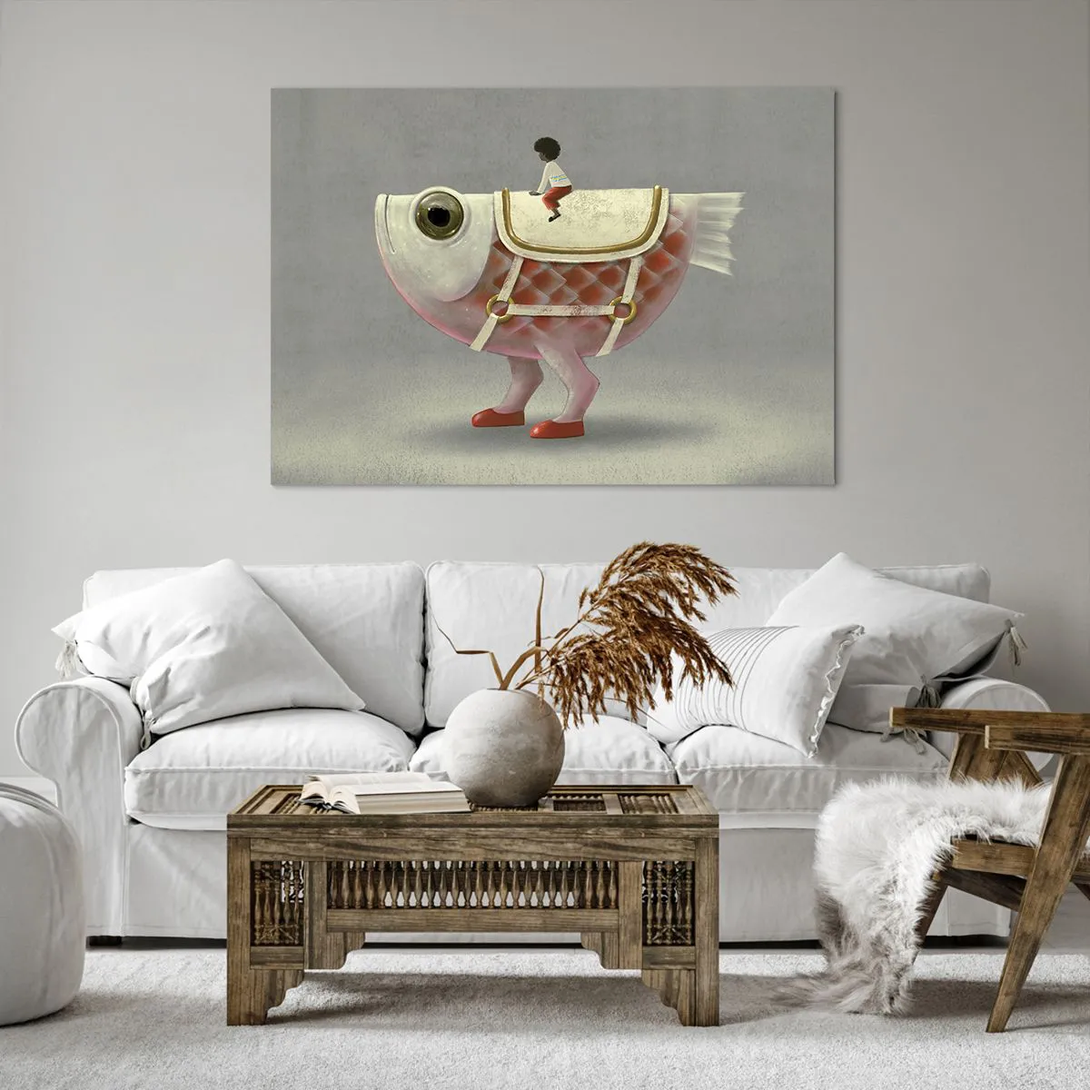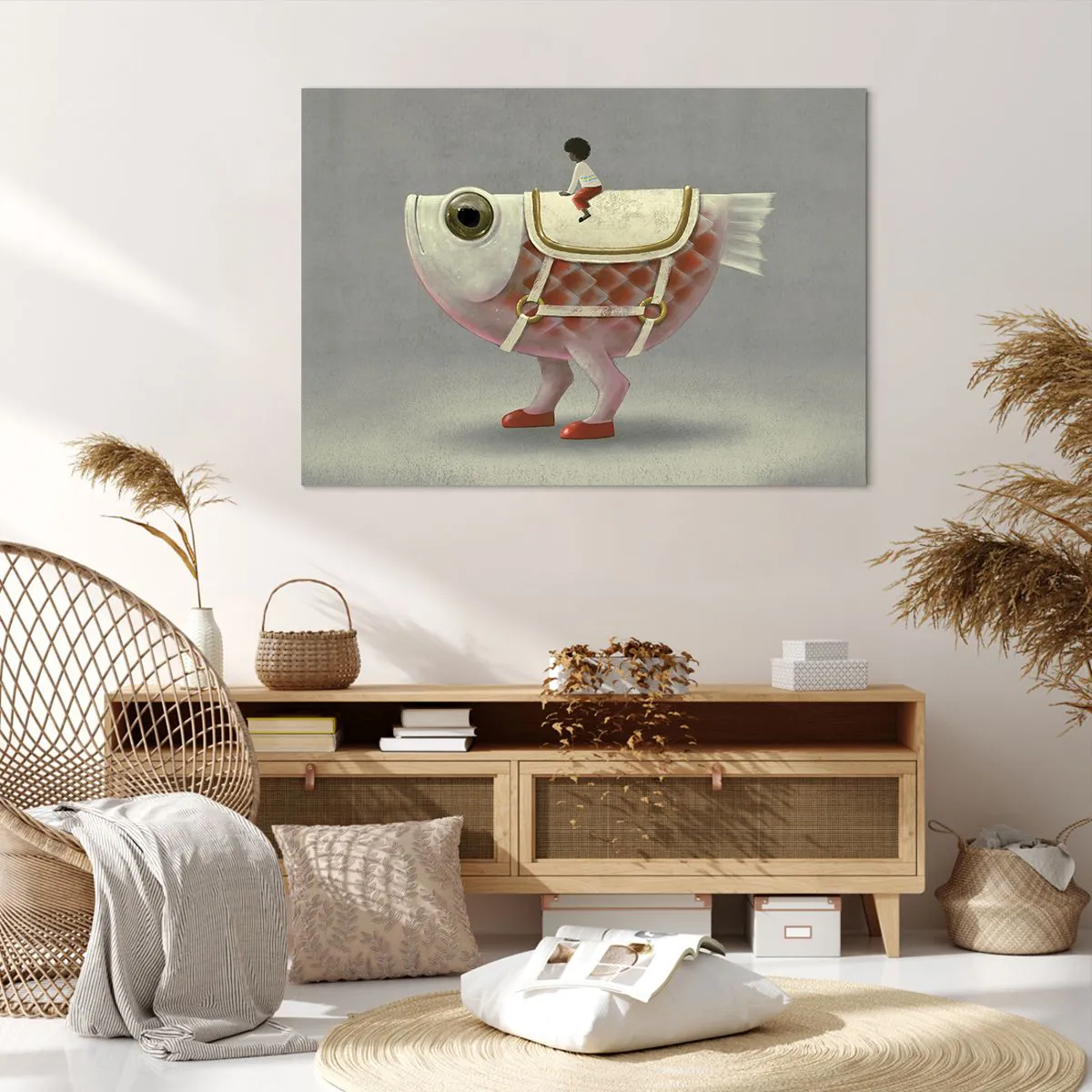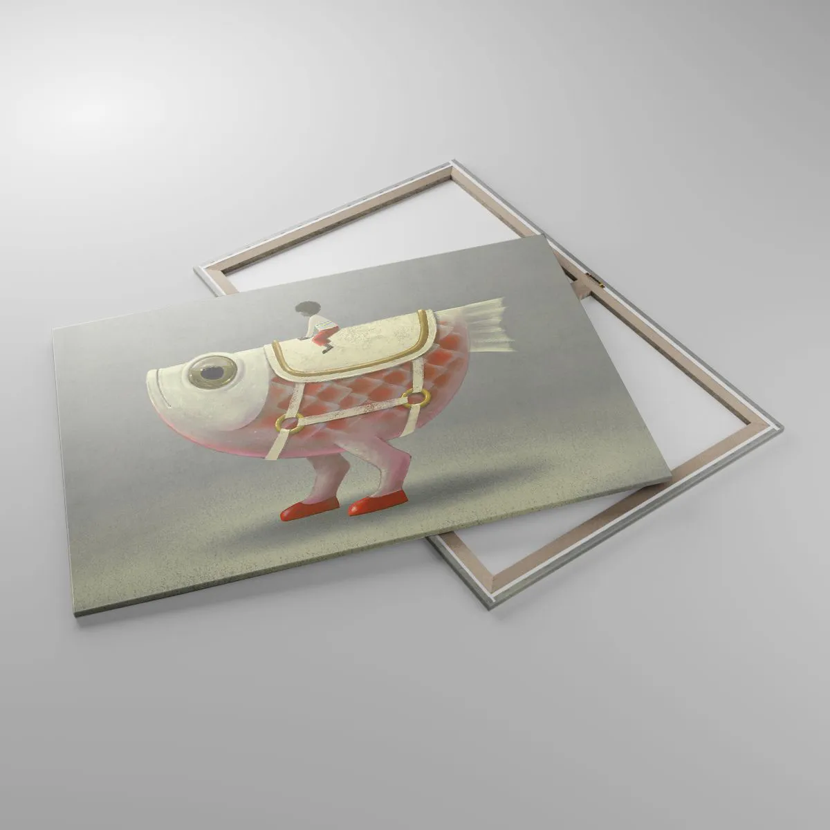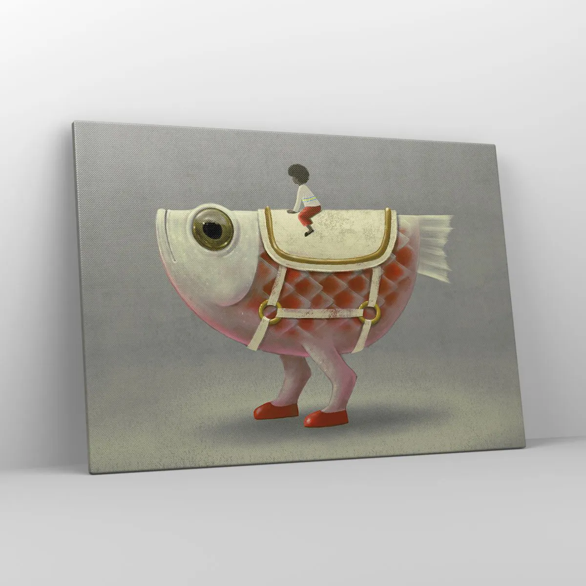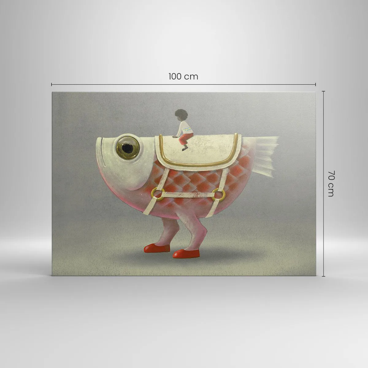 Bild auf Leinwand - Leinwandbild - Ein schicker Fischreiter mit Beinen und Sattel - 100x70cm - Reiter auf einem surrealen Fisch - Moderne Wanddekoration für Wohnzimmer und Schlafzimmer ARTTOR