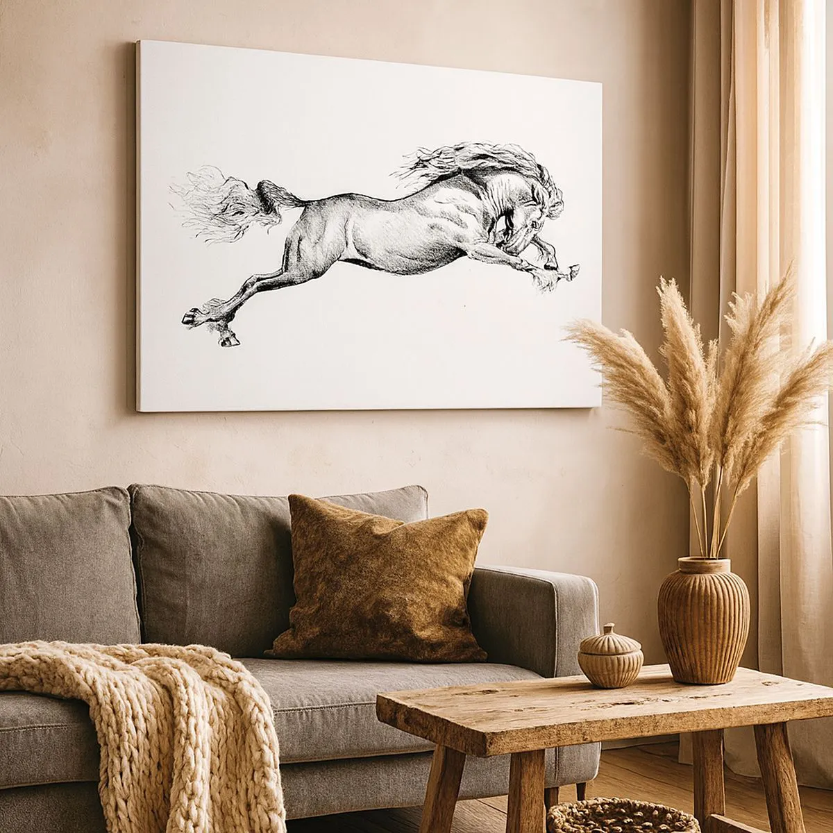• Eine schwarz-weiße Skizze eines Pferdes im dynamischen Galopp vor weißem Hintergrund. Das Bild bringt Bewegung und Eleganz in moderne Innenräume.