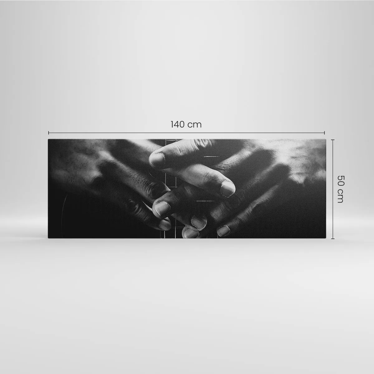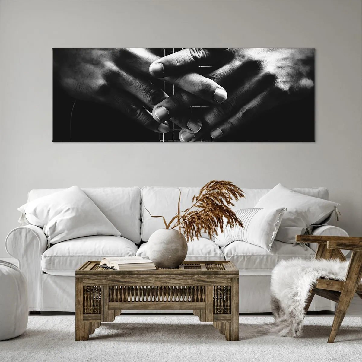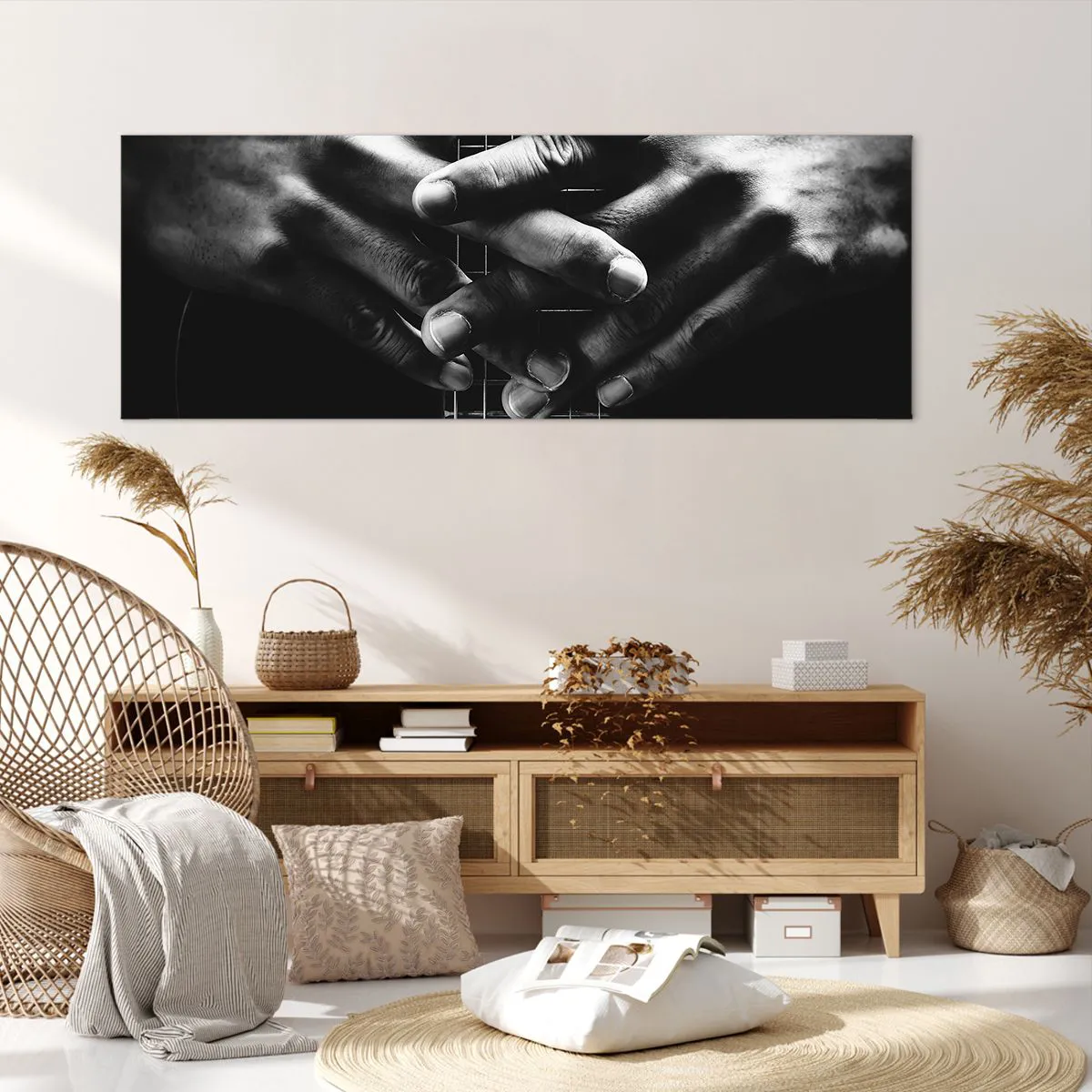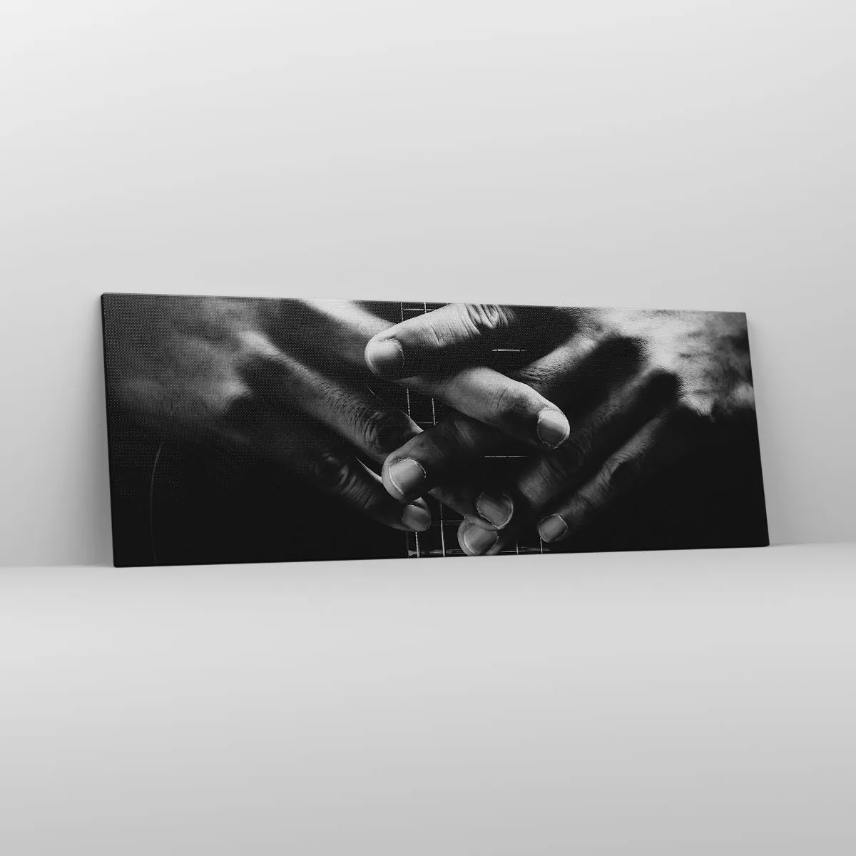 Bild auf Leinwand - Leinwandbild - Hände auf einer Gitarre in einem monochromen Ton gefaltet - 140x50cm - Gebet des Künstlers - Moderne Wanddekoration für Wohnzimmer und Schlafzimmer ARTTOR
