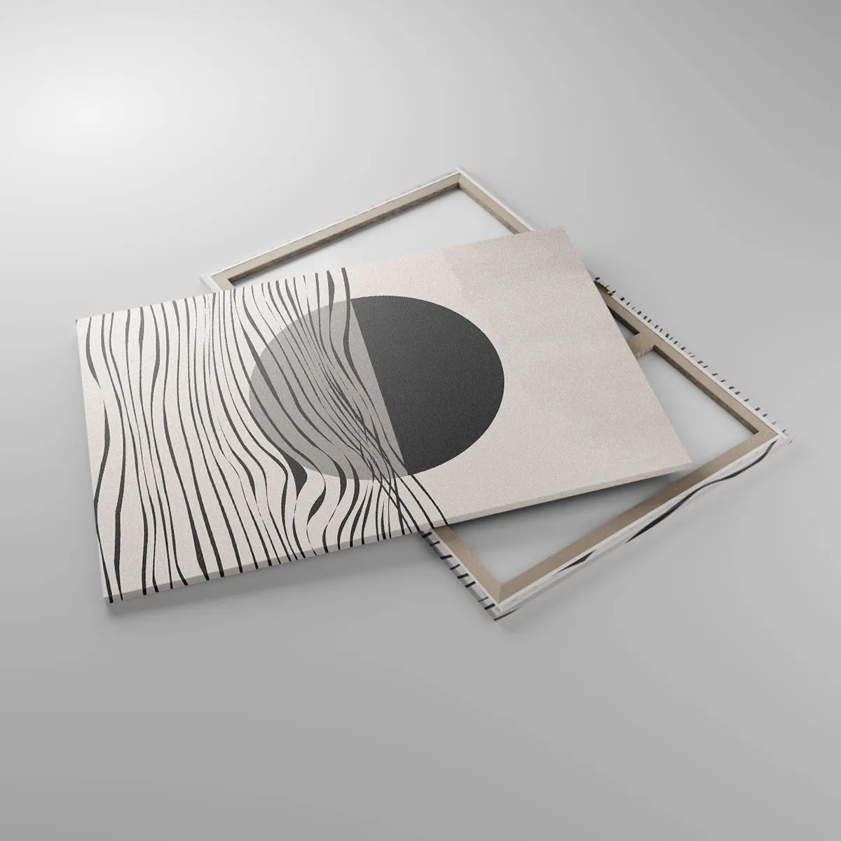 Die Leinwand wird über den Rahmen gespannt. Die Seiten und Kanten werden gedruckt, um das Bild fortzusetzen. Das Bild ist fertig zum Aufhängen an der Wand. Jedes Produkt hat einen am Rahmen befestigten Anhänger und ein Montageset (Schraube + Stift).