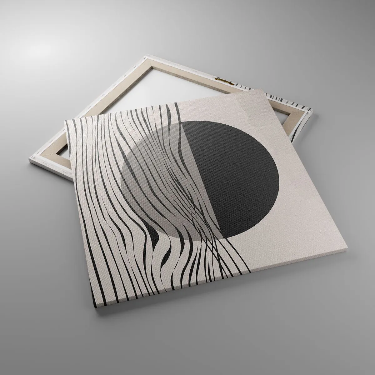 Die Leinwand wird über den Rahmen gespannt. Die Seiten und Kanten werden gedruckt, um das Bild fortzusetzen. Das Bild ist fertig zum Aufhängen an der Wand. Jedes Produkt hat einen am Rahmen befestigten Anhänger und ein Montageset (Schraube + Stift).