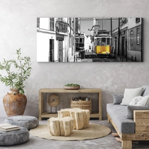 Bild auf Leinwand - Leinwandbild - Eine gelbe Straßenbahn auf den Straßen von Lissabon in einer monochromen Umgebung - 70x50cm - Der Geist von Lissabon - Moderne Wanddekoration für Wohnzimmer und Schlafzimmer ARTTOR