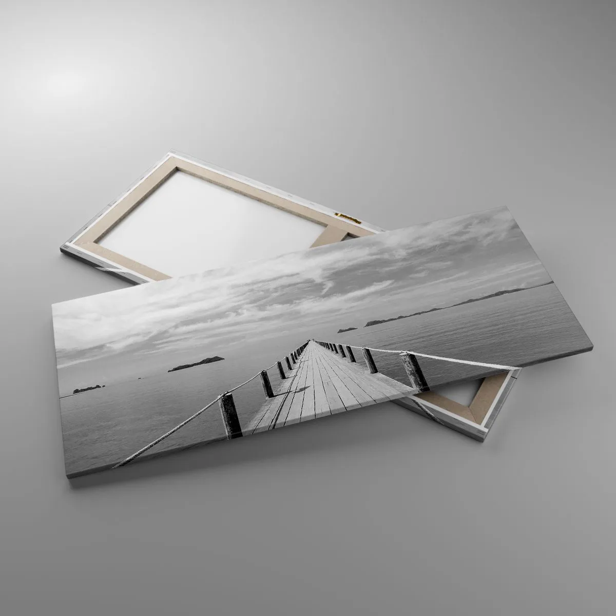 Die Leinwand wird über den Rahmen gespannt. Die Seiten und Kanten werden gedruckt, um das Bild fortzusetzen. Das Bild ist fertig zum Aufhängen an der Wand. Jedes Produkt hat einen am Rahmen befestigten Anhänger und ein Montageset (Schraube + Stift).