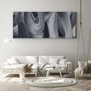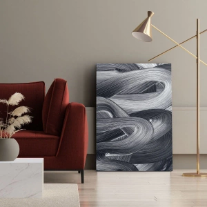 Die Leinwand wird über den Rahmen gespannt. Die Seiten und Kanten werden gedruckt, um das Bild fortzusetzen. Das Bild ist fertig zum Aufhängen an der Wand. Jedes Produkt hat einen am Rahmen befestigten Anhänger und ein Montageset (Schraube + Stift).