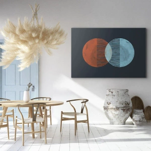Die Leinwand wird über den Rahmen gespannt. Die Seiten und Kanten werden gedruckt, um das Bild fortzusetzen. Das Bild ist fertig zum Aufhängen an der Wand. Jedes Produkt hat einen am Rahmen befestigten Anhänger und ein Montageset (Schraube + Stift).
