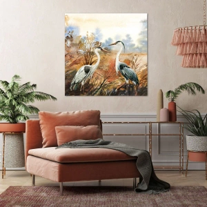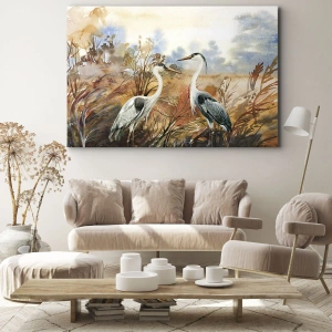 Der Aquarellstil verleiht dem Gemälde Leichtigkeit und Eleganz. Herbstfarben – Weiß, Beige und Goldtöne – bilden eine harmonische Palette, die dem Interieur Wärme und Ruhe verleiht. Zwei Reiher, die Harmonie und Verbundenheit mit der Natur symbolisieren, verschmelzen perfekt mit den Pflanzenmotiven und verleihen dem gesamten Werk einen einzigartigen Charakter.