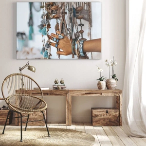 Bild auf Leinwand - Leinwandbild - Eine mit Boho-Schmuck geschmückte Hand mit Dekorationen im Hintergrund - 70x50cm - Lokale Schätze - Moderne Wanddekoration für Wohnzimmer und Schlafzimmer ARTTOR