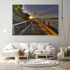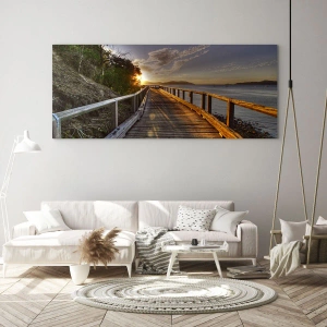 Glasbild - Bild auf glas - Ein Holzsteg führt dem Sonnenuntergang über dem Wasser entgegen - 140x50cm - Gehen, weiter der Sonne entgegengehen - Moderne Wanddekoration für Wohnzimmer und Schlafzimmer ARTTOR