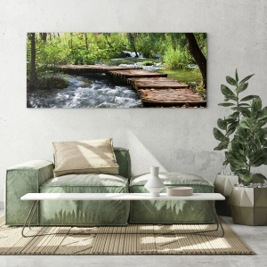 Glasbild - Bild auf glas - Eine Holzbrücke über einen rauschenden Bach, umgeben vom Grün des Waldes. - 80x120cm - Über der schaumigen Kaskade - Moderne Wanddekoration für Wohnzimmer und Schlafzimmer ARTTOR