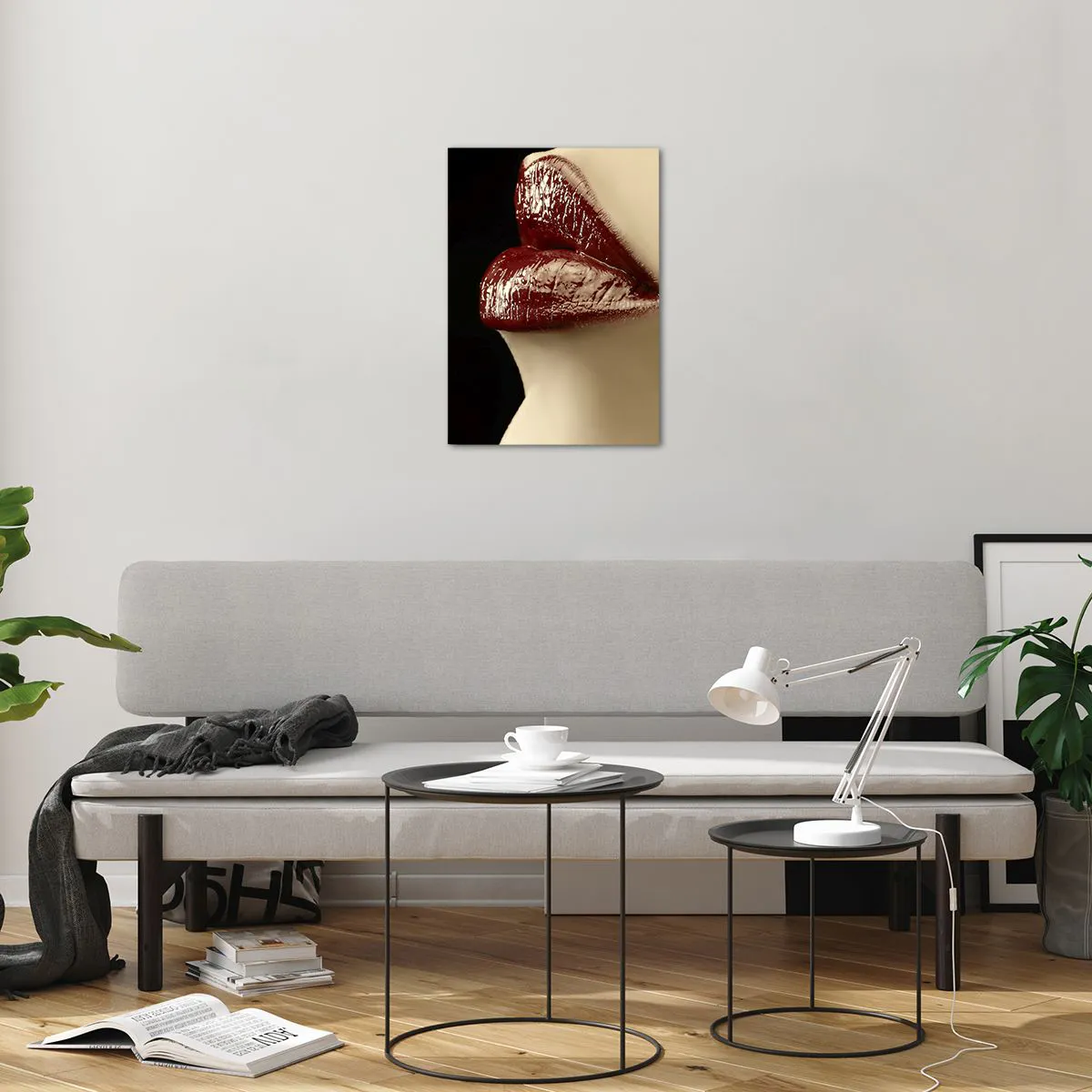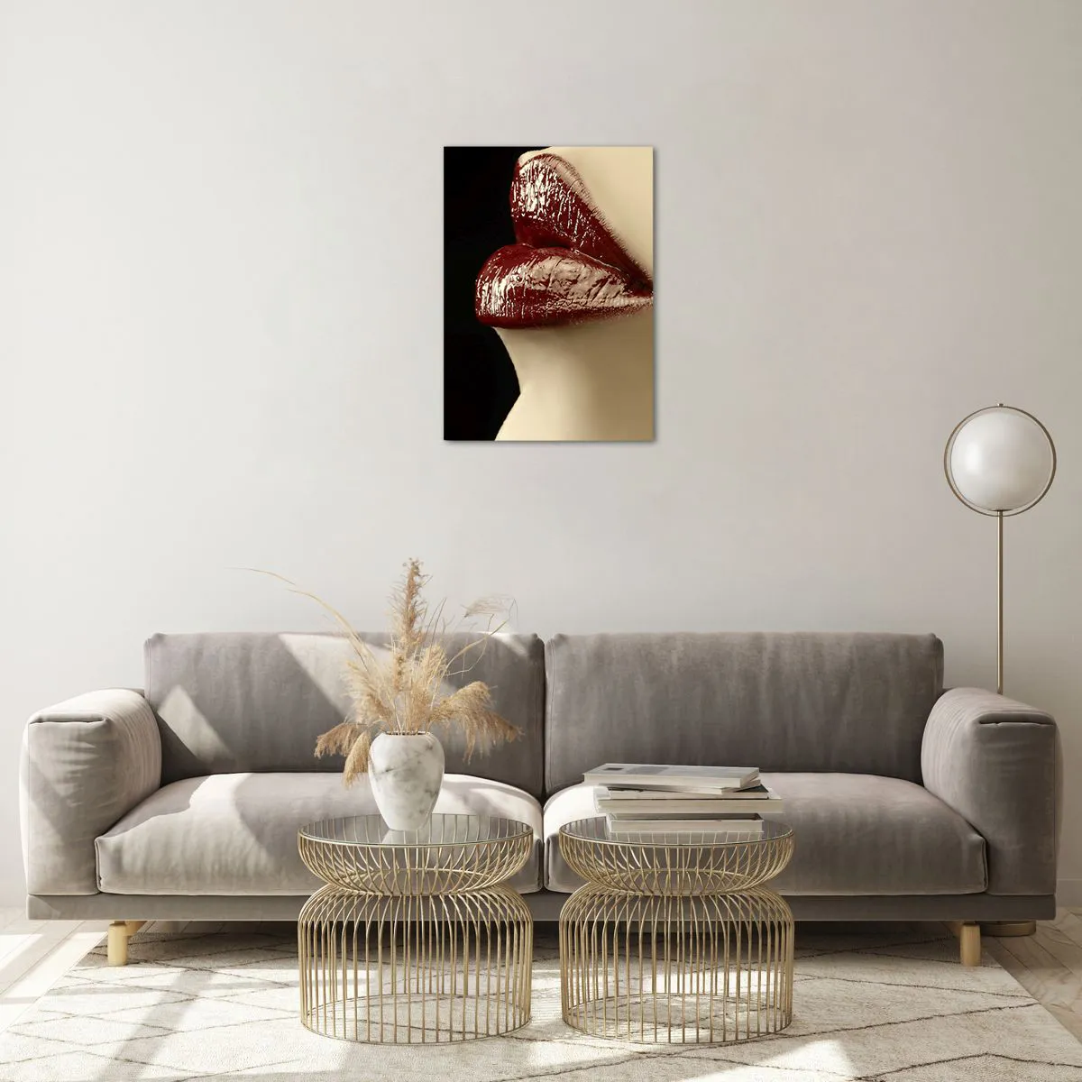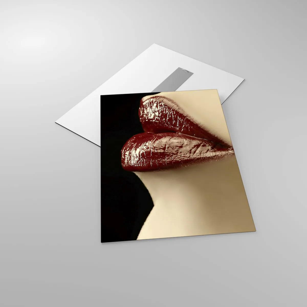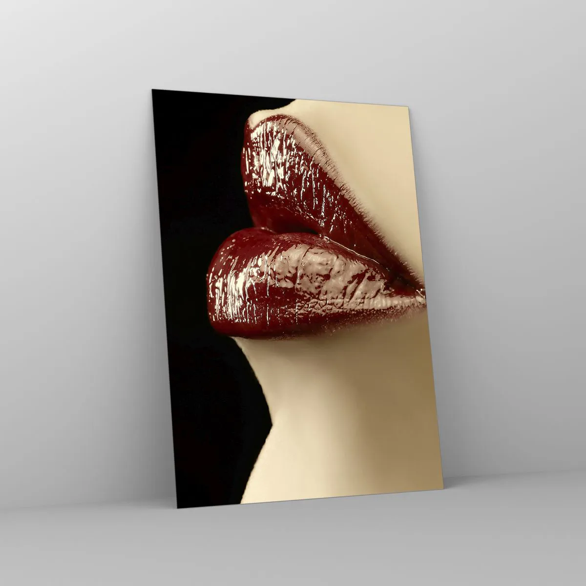 Glasbild - Bild auf glas - Sinnliche Lippen mit karminrotem Lippenstift auf dunklem Hintergrund - 50x70cm - Sinnlichkeit und Brillanz von Karmin - Moderne Wanddekoration für Wohnzimmer und Schlafzimmer ARTTOR