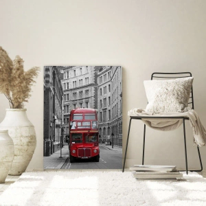 Glasbild - Bild auf glas - Ein roter Bus durch die einfarbigen Straßen der Stadt - 120x80cm - Der Alltag muss nicht grau sein - Moderne Wanddekoration für Wohnzimmer und Schlafzimmer ARTTOR