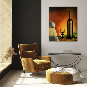 Glasbild - Bild auf glas - Trauben auf einem Fass in rustikalem Ambiente mit Wein im Hintergrund - 50x70cm - Stillleben mit einer Flasche Wein und einer Weintraube - Moderne Wanddekoration für Wohnzimmer und Schlafzimmer ARTTOR
