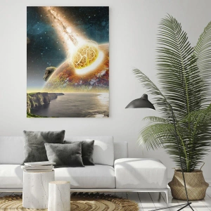 Glasbild - Bild auf glas - Ein Meteorit kollidiert mit einem Planeten in einer kosmischen Landschaft. - 70x100cm - Kosmisches Drama - Moderne Wanddekoration für Wohnzimmer und Schlafzimmer ARTTOR