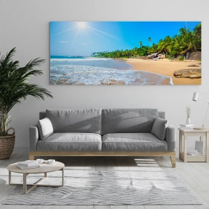 Wandgemälde - Ein exotischer Ort für Sie - Ein tropischer Strand mit Palmen und Wellen unter blauem Himmel