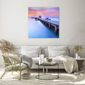 Glasbild - Bild auf glas - Holzsteg bei Sonnenaufgang auf ruhigem Wasser - 120x80cm - Ein Meer der Ruhe bis zum Horizont - Moderne Wanddekoration für Wohnzimmer und Schlafzimmer ARTTOR