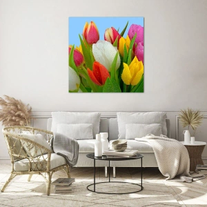 Glasbild - Bild auf glas - Bunte Tulpen mit Tautropfen auf blauem Hintergrund bedeckt - 70x100cm - Ein blumiger Regenbogen in Tautropfen - Moderne Wanddekoration für Wohnzimmer und Schlafzimmer ARTTOR